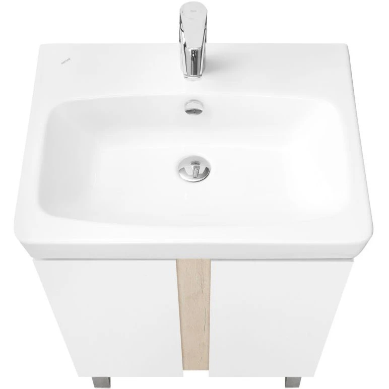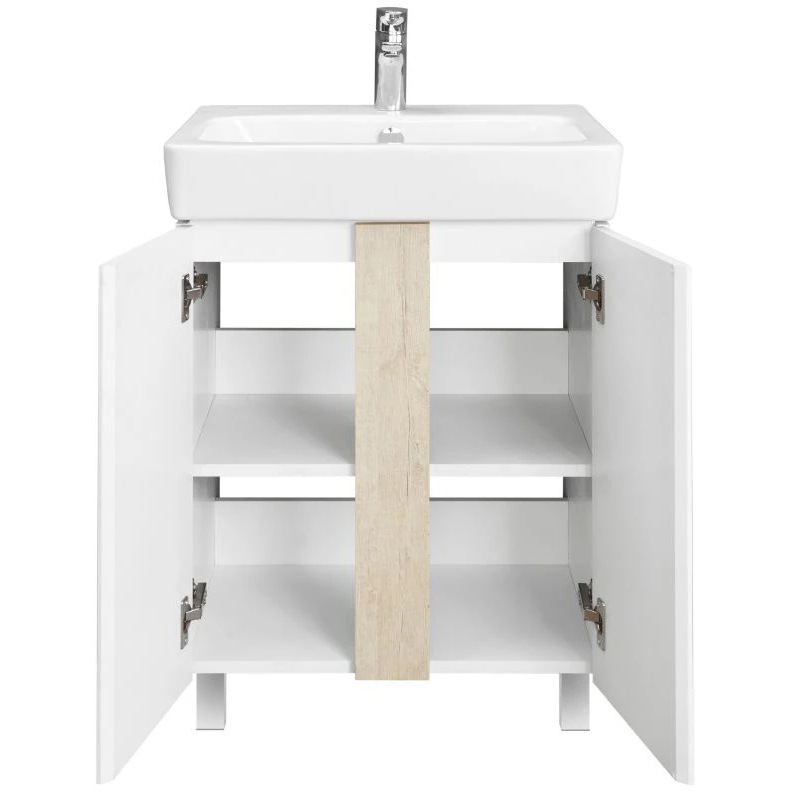 Лаконичная тумба Капри выполнена в современном дизайне: сочетание белого глянца (ВЛДСП в покраске) с древесным акцентом в цвете дуб верона (ламинированное влагостойкое ДСП). Все детали тумбы выполнены из влагостойкой ламинированной ДСП, предназначенной для использования в условиях ванной комнаты. Благодаря специальной обработке торца фасада под углом, открытие производится за створку. Универсальный функционал тумбы – распашная створка, за которой расположена полочка. Регулируемые опоры в комплекте.