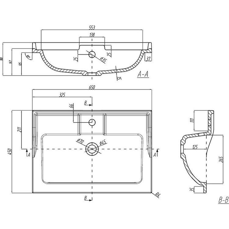 - Раковина AQUATON Фабиа 650 выполнена из искусственного мрамора с габаритами 65x45 см и включает арматуру для слива-перелива.