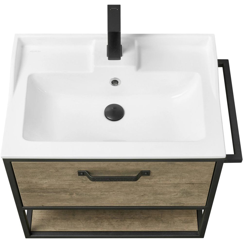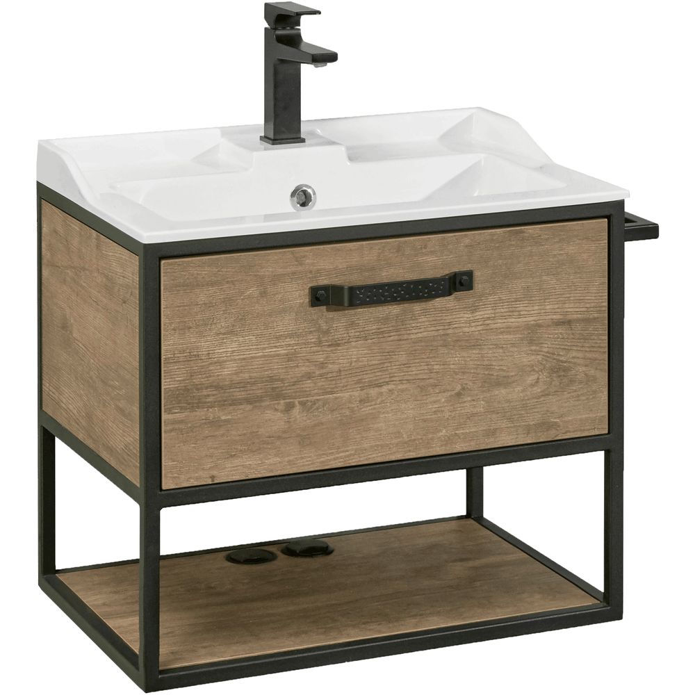 Тумба под раковину AQUATON Лофт Фабрик 65 в эффектном цвете дуб кантри не оставит вас равнодушными. Она объединяет в себе изысканность древесного декора и индустриальный стиль металла. Вместительный ящик с механизмом плавного выдвижения и открытая полка позволяют хранить все необходимое. Уникальная ручка прекрасно сочетается с металлическими черными профилями и полотенцедержателем, который можно установить как слева, так и справа, по вашему желанию.