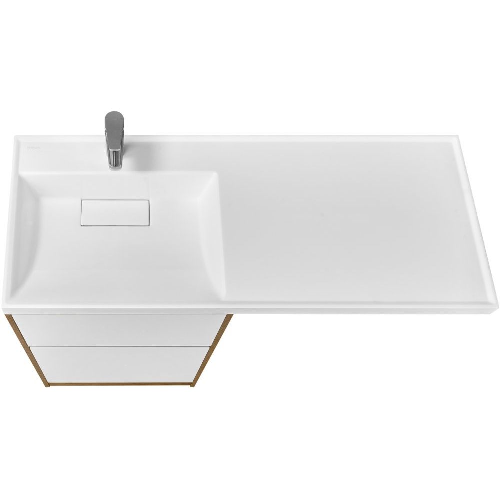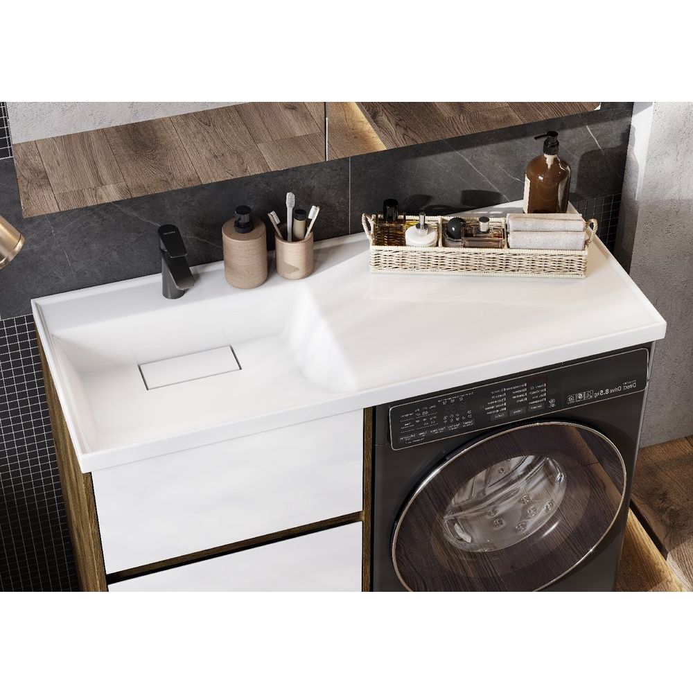 - Габариты раковины: 120x50 см, оснащена декоративной накладкой на слив.