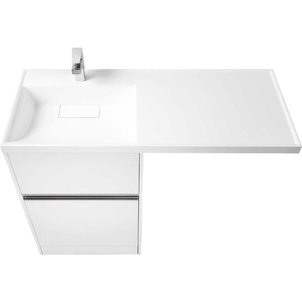 Тумба под раковину AQUATON Лондри 60 L имеет размеры 57x49,6x88,2 см и является напольным решением с опорными ножками для максимальной устойчивости. Изготовленный из ЛДСП, корпус и фасад покрыты ламинатом, что обеспечивает долговечность изделия. Встроенные ящики с нажимным механизмом открывания и механизм доводчика делают использование тумбы максимально удобным. Мебельная раковина в комплекте выполнена из искусственного мрамора, размером 120х50 см и оснащена декоративной накладкой на слив. Она имеет 1 отверстие под смеситель и подходит для сифонов диаметром 3.2 см.