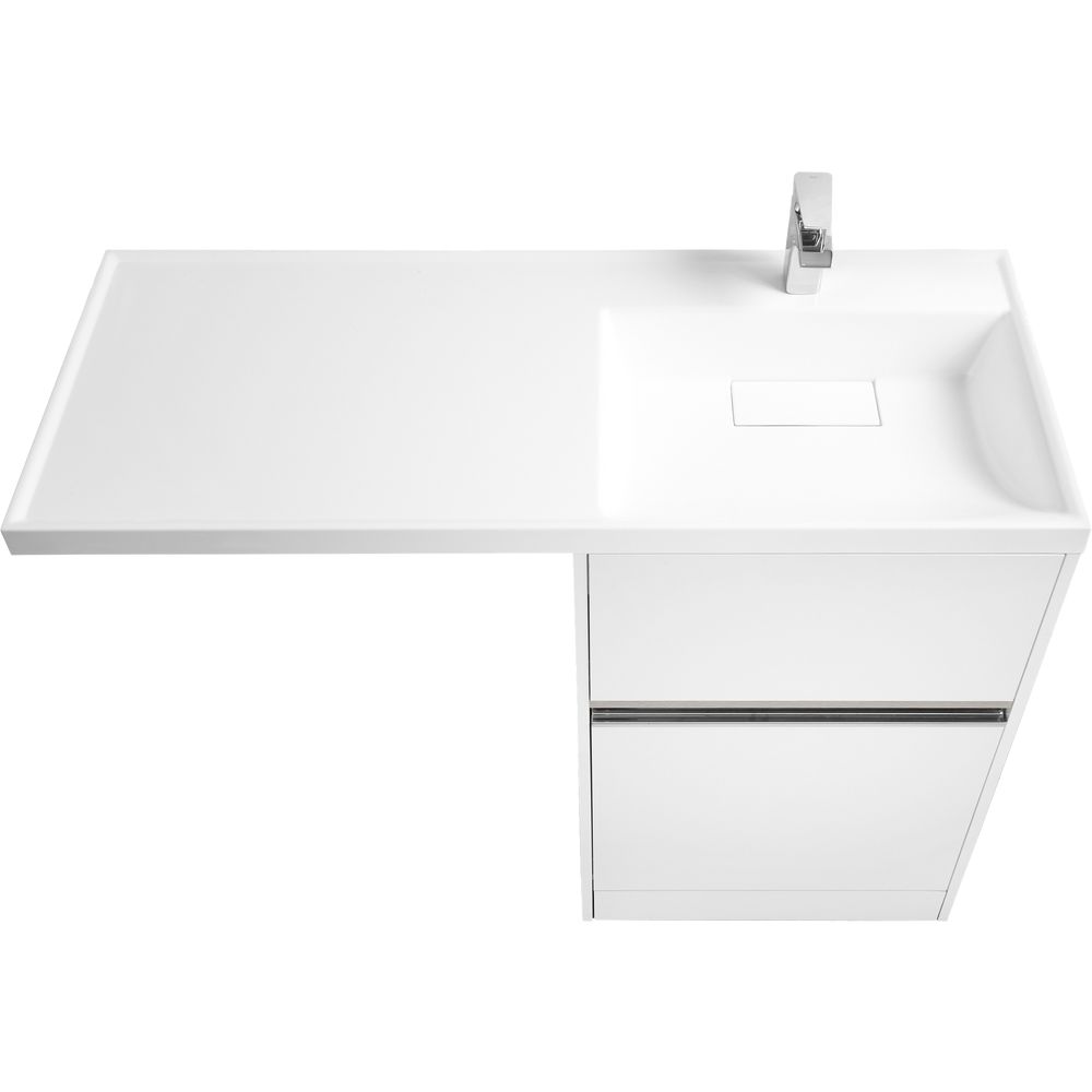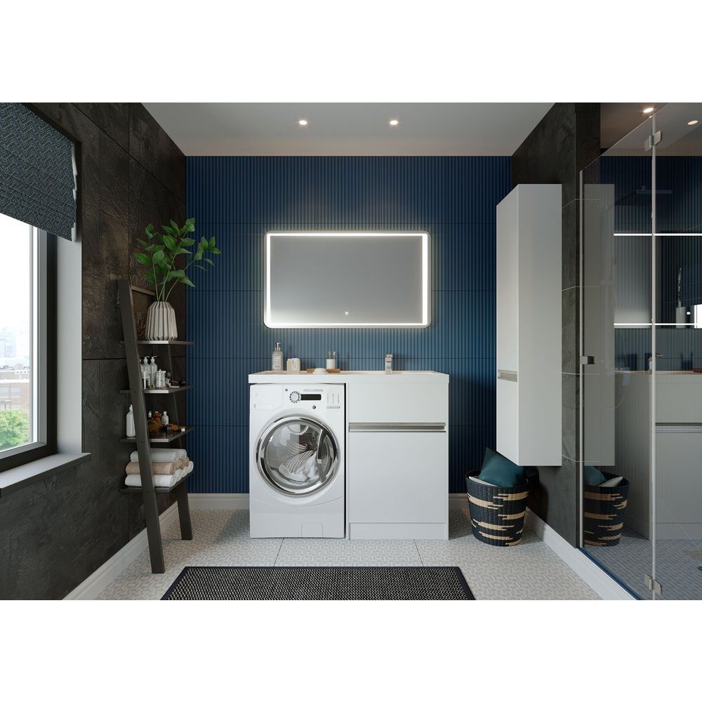 Тумба для комплекта AQUATON Лондри 60 под стиральную машину обладает габаритами 57x49,6x88,2 см и подходит для напольной установки. Корпус и фасад выполнены из ЛДСП с ламинированным покрытием, что обеспечивает устойчивость к влажности. Раковина, изготовленная из искусственного мрамора, имеет размеры 120x50 см и оснащена декоративной накладкой на слив, а также отверстием для смесителя.