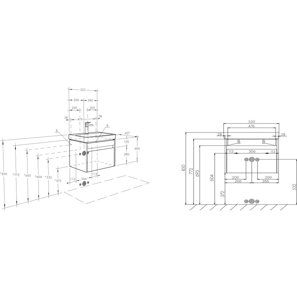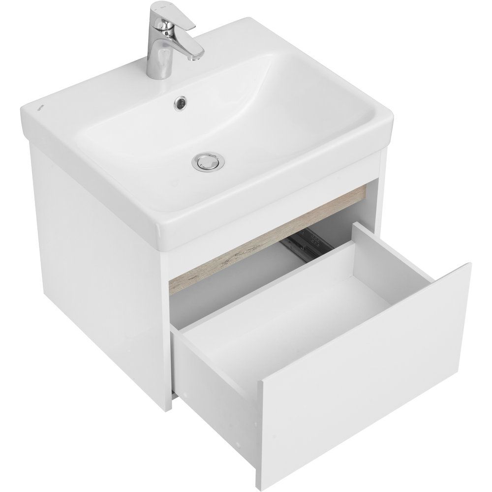 Тумба для комплекта Марти имеет габариты 53,2x42,7x40 см и представляет собой подвесную конструкцию, оснащенную механизмом доводчика для плавного закрывания ящиков. Изготовлена из ЛДСП, с покрытием из эмали и ламината. Мебельная раковина AQUATON Сканди Адриана 55, выполненная из фарфора, имеет размер 55x45 см и подходит для сифона диаметром 3.2 см. Она оборудована встроенным сливом-переливом и готовым отверстием для смесителя. Гарантии составляют 3 года на тумбу и 10 лет на раковину.