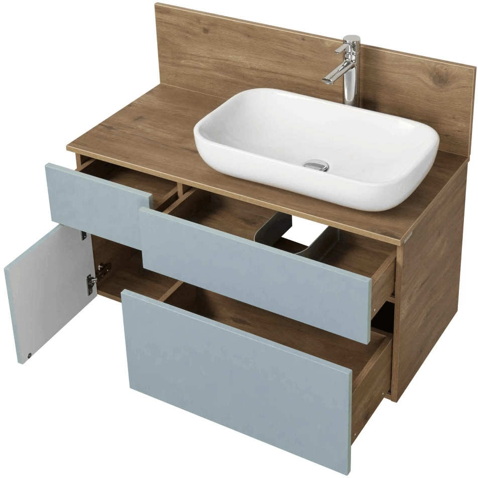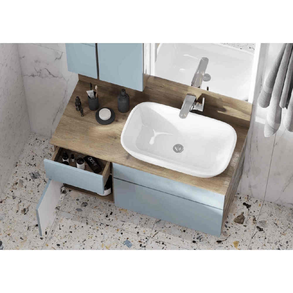 Насыщенный оттенок фасадов в пленке фьерд в сочетании с натуральным декором дуб рустикальный с самого утра поднимет настроение своим обладателям и обеспечит позитивный настрой. Тумба Мишель 100 очень вместительная и функциональная: слева располагается небольшой выдвижной ящик, идеально подходящий для хранения мелочей, под которым находится отделение со створкой, а справа у тумбы расположены два вместительных ящика полного выдвижения, снабженных довод-чиками. Все элементы оснащены системой открывания push-to-open.