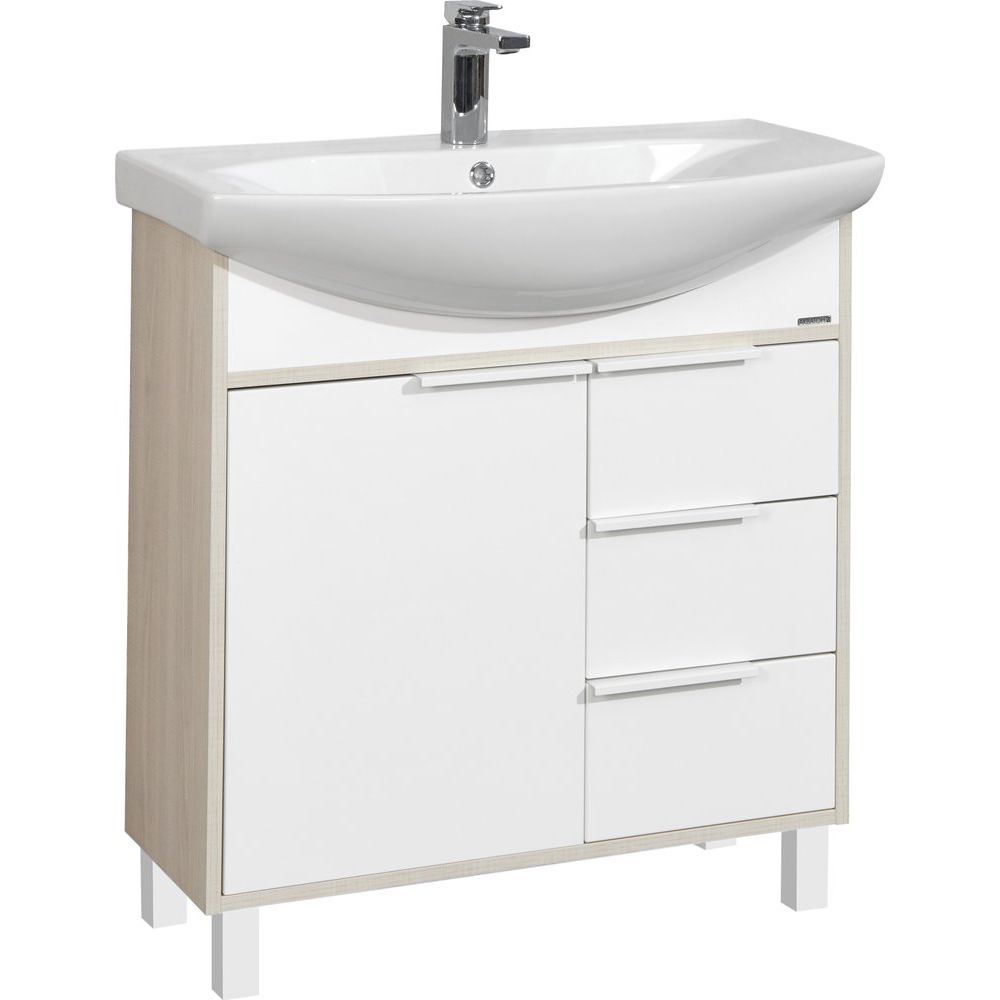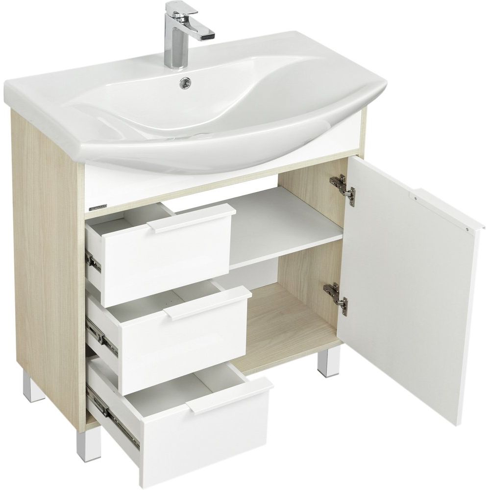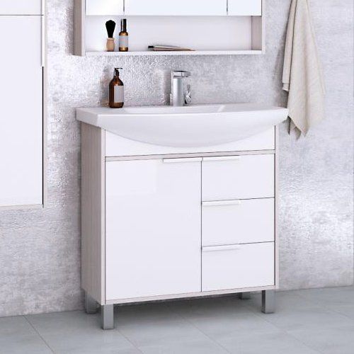 Тумба AQUATON Рико 80 имеет размеры 76x72x85 см и предназначена для напольной установки. Корпус создаётся из ДСП с покрытием из пленки и ламината, что обеспечивает долговечность. Фасады из МДФ покрыты эмалью, что придает им элегантный вид. Вся фурнитура выполнена в белом цвете. Гарантия на мебель составляет 3 года.