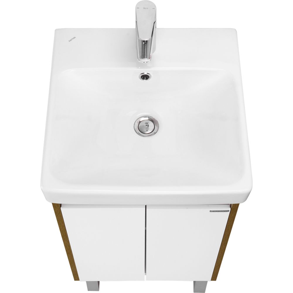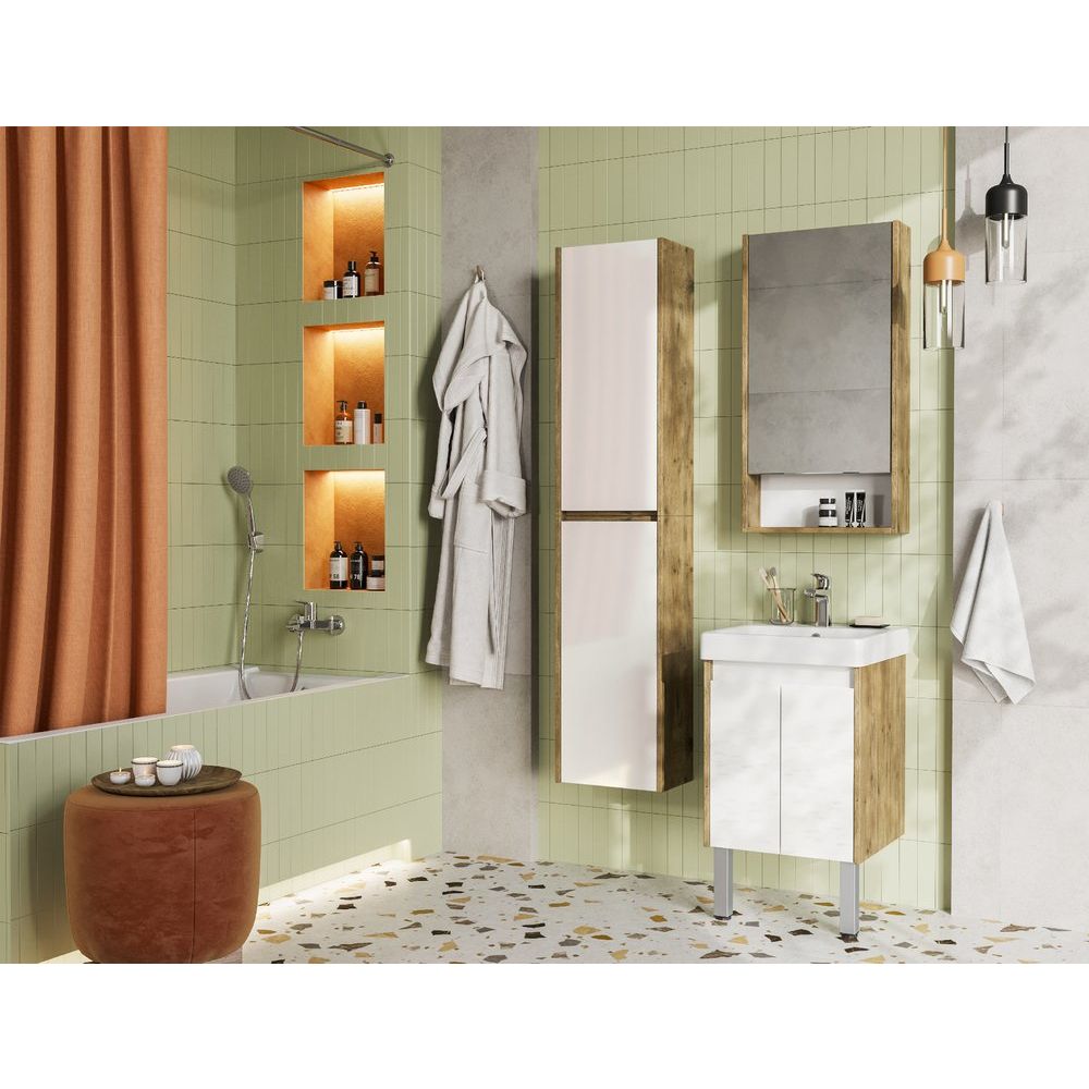 Тумба в комплекте выполнена из ЛДСП с ламинатным покрытием, что обеспечивает долговечность и простоту ухода. Габариты составляют 43,2x42,7x99,1 см, подходящие для небольших ванн. Подвесная конструкция с декоративными ножками придаёт легкость и изысканность. Мебельная раковина "Адриана 45" изготовлена из высококачественного фарфора и обладает габаритами 45,5x45,5 см. Встроенный слив-перелив и одно готовое отверстие под смеситель позволяют быстро установить и начать использование. На оба изделия предоставляется гарантия: 3 года на тумбу и 10 лет на раковину.