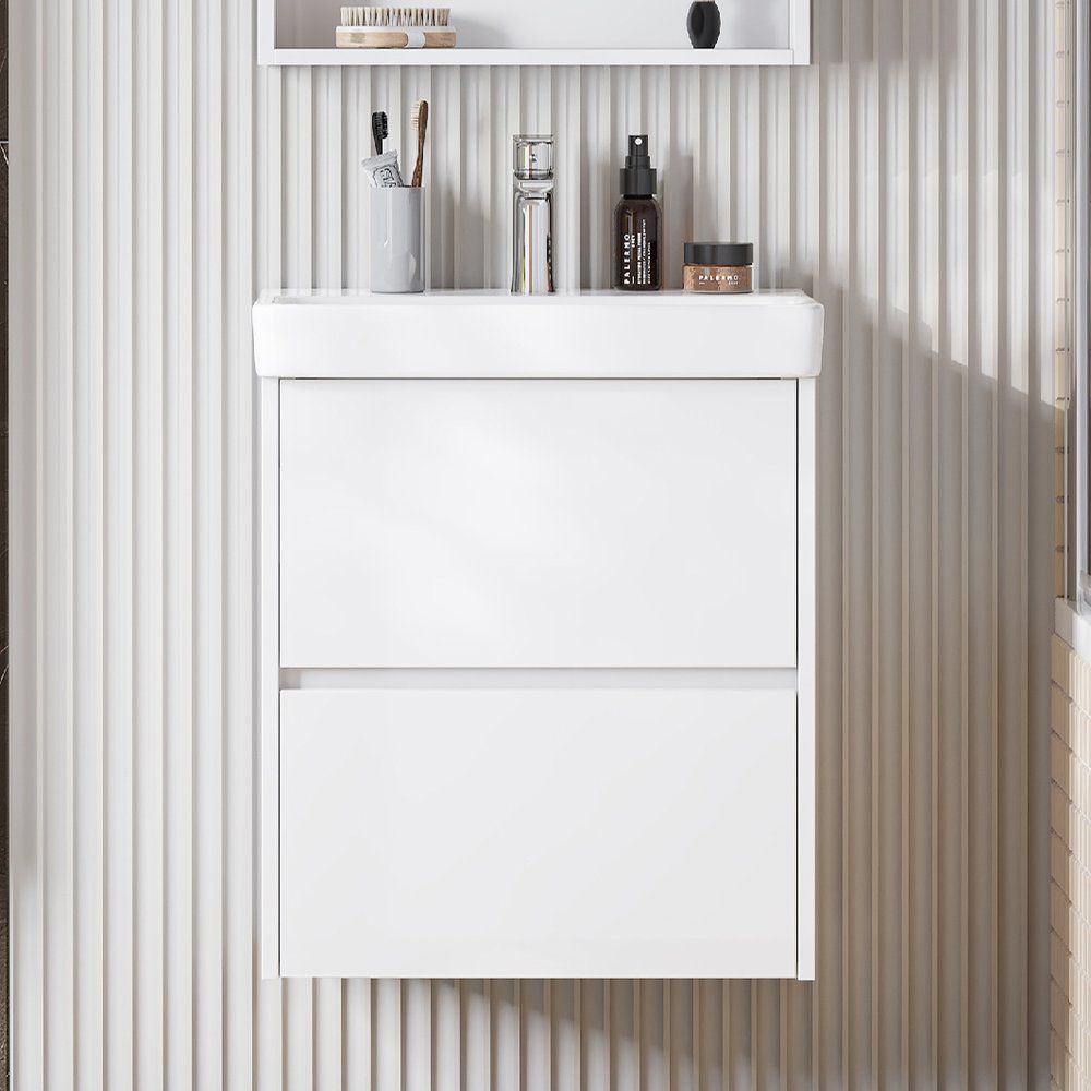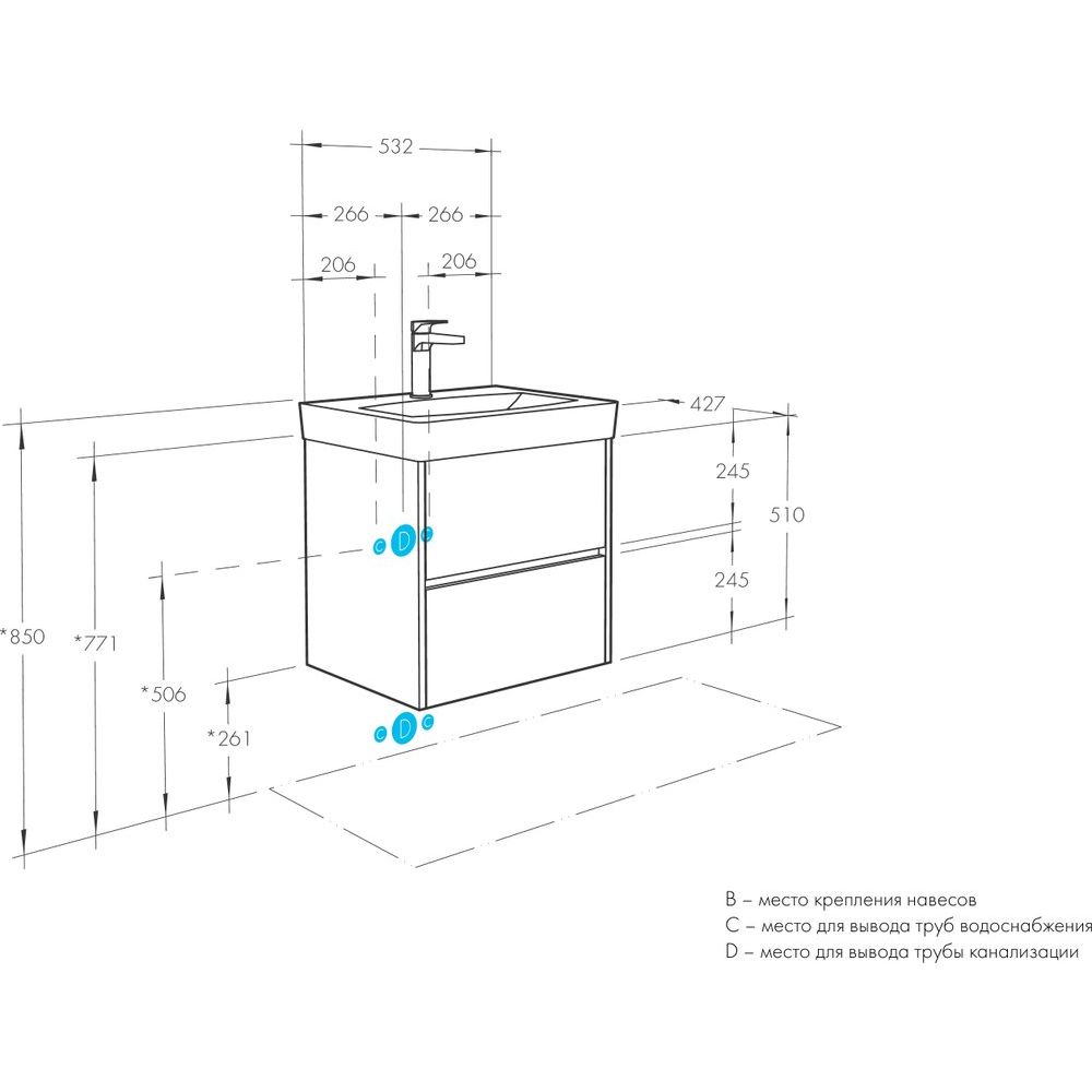 Комплект включает в себя подвесную тумбу габаритами 53,2x42,7x51 см и фарфоровую раковину размером 55x45 см. Корпус и фасад тумбы изготовлены из ЛДСП, покрытые соответственно ламинатом и эмалью. Открывание ящиков осуществляется нажимным механизмом push-to-open с направляющими скрытого монтажа, что подчёркивает современный подход к дизайну. Раковина оснащена встроенным сливом-переливом и одним готовым отверстием для смесителя. Гарантия на тумбу составляет 3 года, на раковину — 10 лет. Изделие произведено в России.