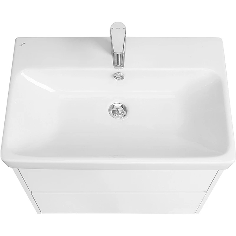 Тумба Сканди 70 выполнена в популярном минималистичном скандинавском стиле. Корпус тумбы выполнен из влагостойкой ЛДСП в белой матовой покраске, а фасады в белой глянцевой покраске. Конструктивно тумба состоит из 2 вместительных ящиков, установленных на направляющие с интегрированной системой push-to-open для комфортного использования. На тумбе нет выступающих деталей и фурнитуры, открытие ящиков реализовано нажатием на фасад. Тумба комплектуется белоснежной раковиной Адриана от бренда Santek. Тумбу по желанию можно использовать в двух вариантах: как подвесную или дополнительно приобрести опоры.