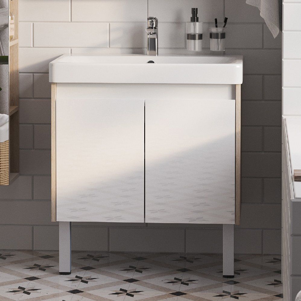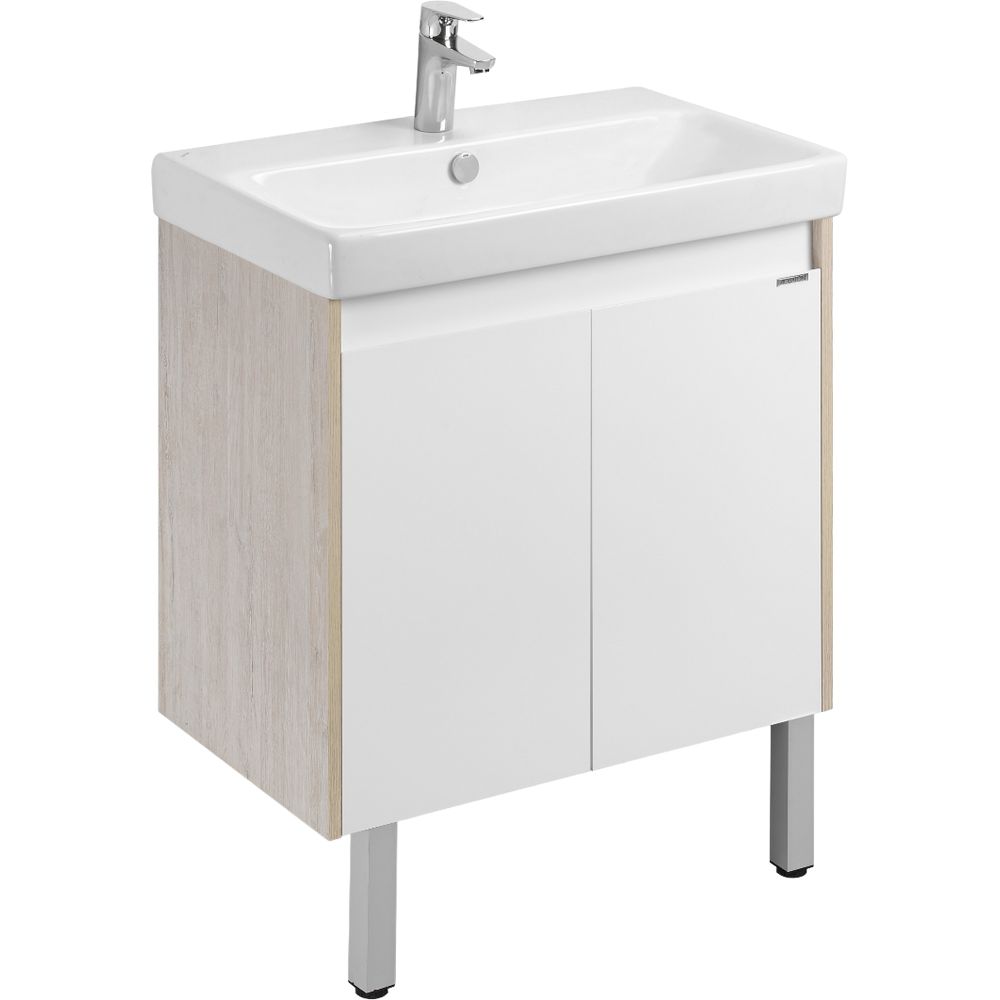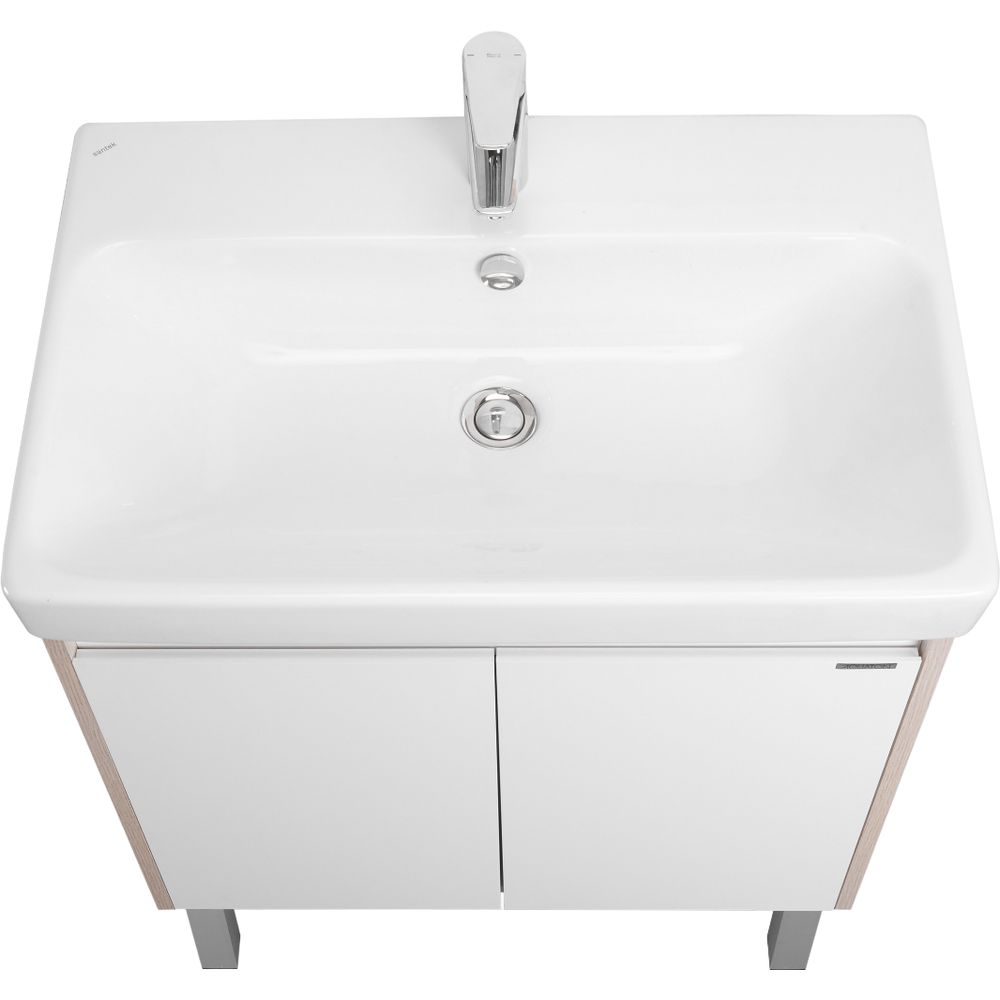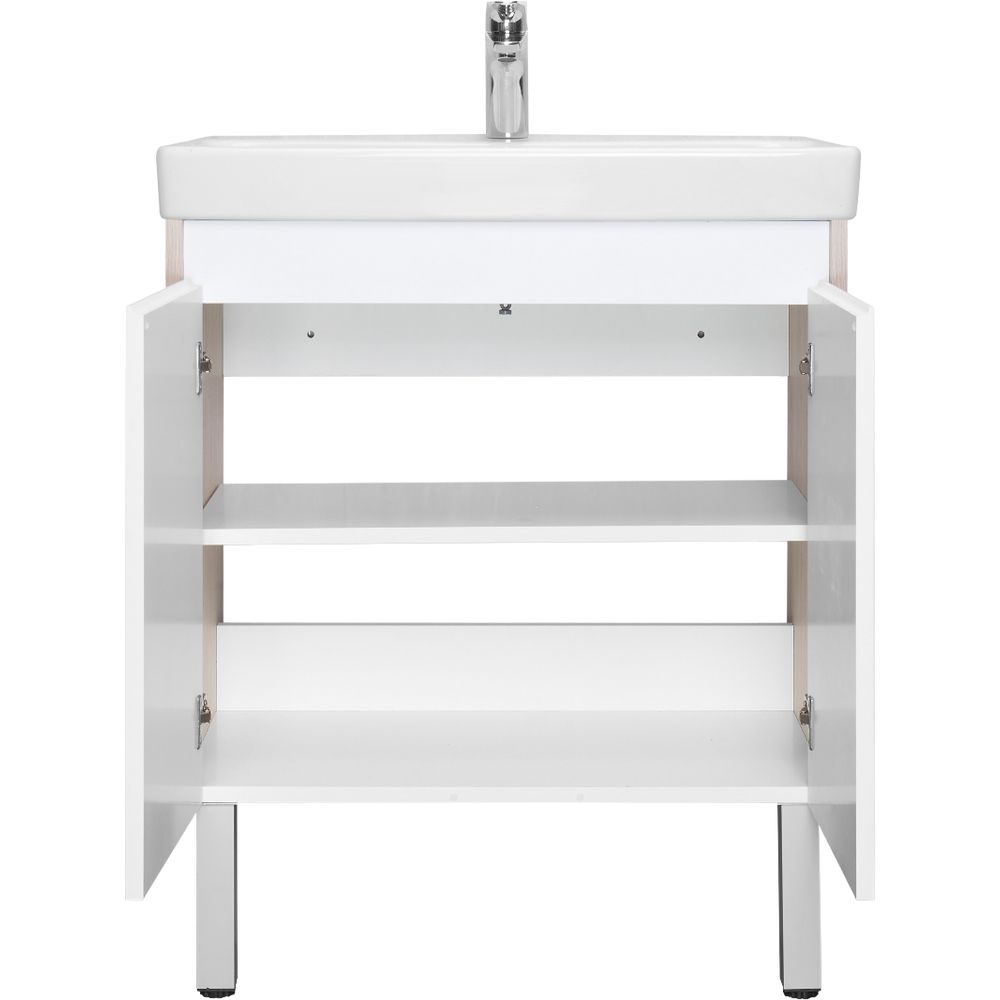 Комплект включает подвесную тумбу и фарфоровую раковину. Тумба выполнена из ЛДСП с габаритами 68,2x42,7x79,1 см и имеет белое глянцевое покрытие в сочетании с декоративными элементами из дуба верона. Раковина из фарфора размером 70,5x45 см снабжена встроенным сливом-переливом и отверстием для смесителя, предназначена для сифонов диаметром 3.2 см. Дополнительно требуется приобрести донный клапан и сифоны с учётом уникальных особенностей конструкции. Гарантия на тумбу 3 года, на раковину — 5 лет.