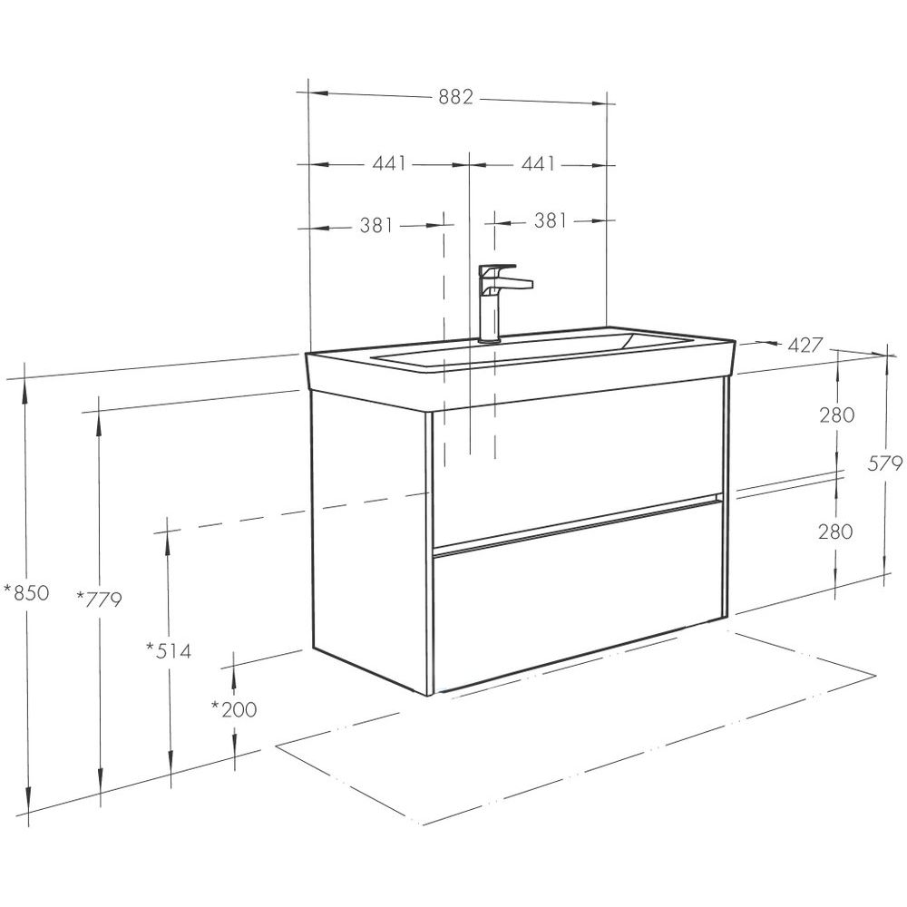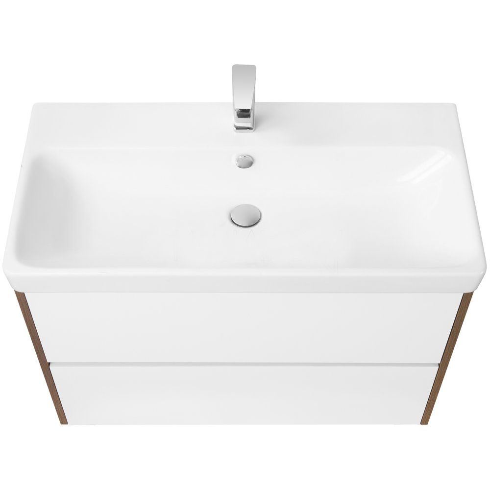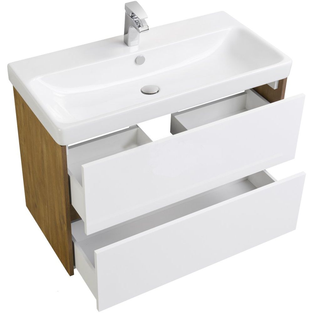 Тумба оснащена корпусом из ЛДСП/ДСП с ламинатным покрытием и фасадами, покрытыми эмалью. Механизм доводчика обеспечивает тихое закрывание, а нажимной механизм открывания облегчает доступ к ящикам. Подвесная конструкция имеет направляющие скрытого монтажа push-to-open. Габариты тумбы составляют 88,2x42,7x57,9 см. Мебельная раковина Адриана 90, выполненная из фарфора, имеет размер 90х45 см и оснащена встроенным сливом-переливом. Комплект требует покупки донного клапана отдельно и имеет одно отверстие под смеситель, рассчитанный на сифон диаметром 3.2 см.