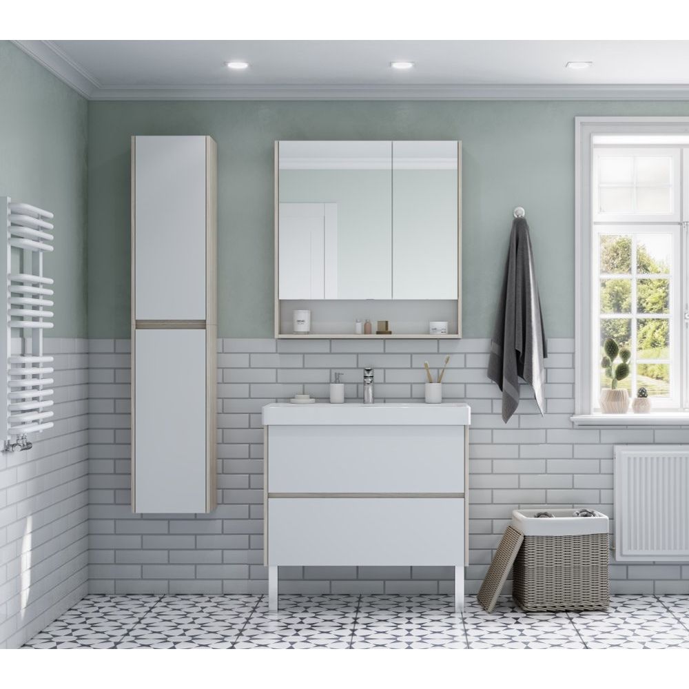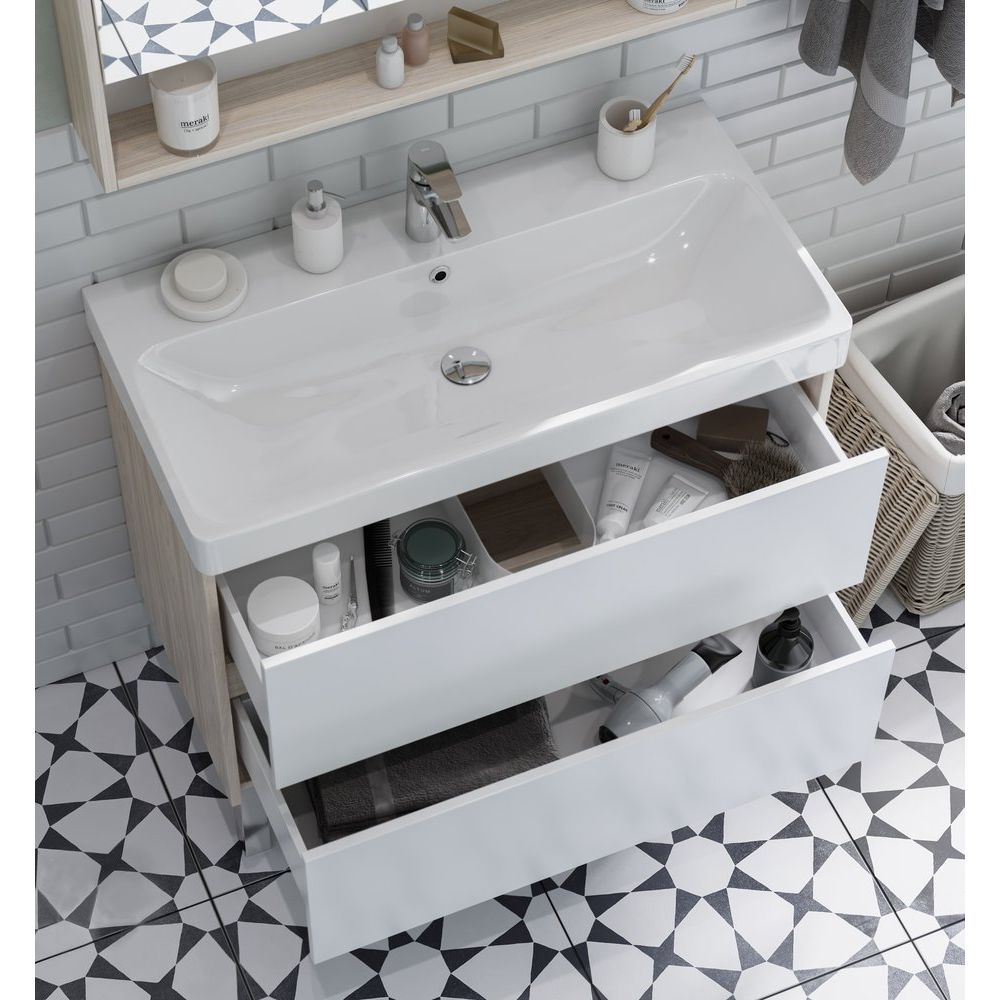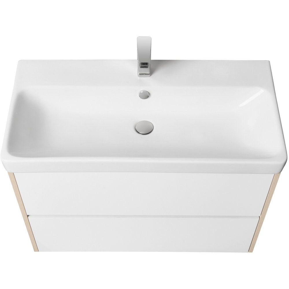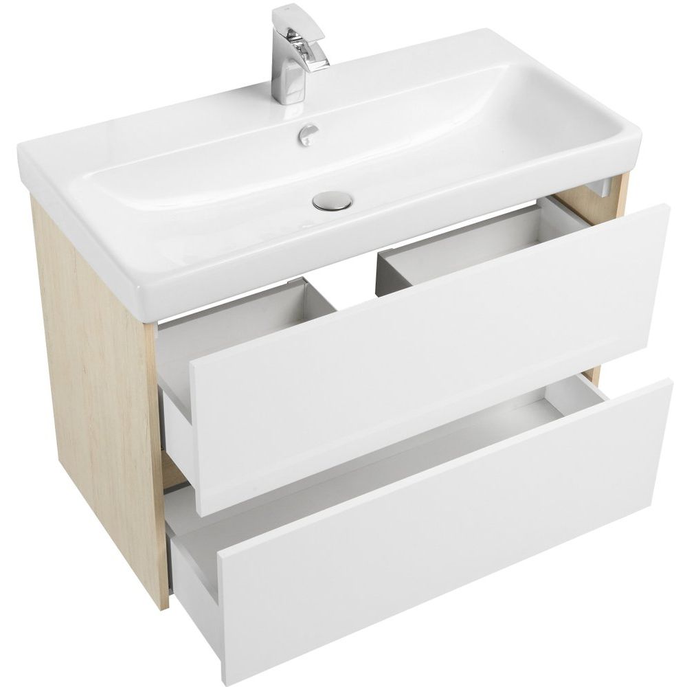 Тумба выполнена из ЛДСП и ДСП с ламинатным покрытием, что обеспечивает ей длительную защиту от влаги и механических повреждений. Эмалевые фасады придают изделию свежий и аккуратный вид. Габариты тумбы составляют 88,2x42,7x57,9 см. Она подвесная и оборудована механизмом доводчика для плавного закрывания, вместе с нажимным механизмом открывания для выдвижных ящиков. В комплект входит мебельная раковина AQUATON Сканди Адриана 90 размером 90x45 см из прочного фарфора. Раковина оснащена встроенным сливом-переливом и имеет готовое отверстие под смеситель.