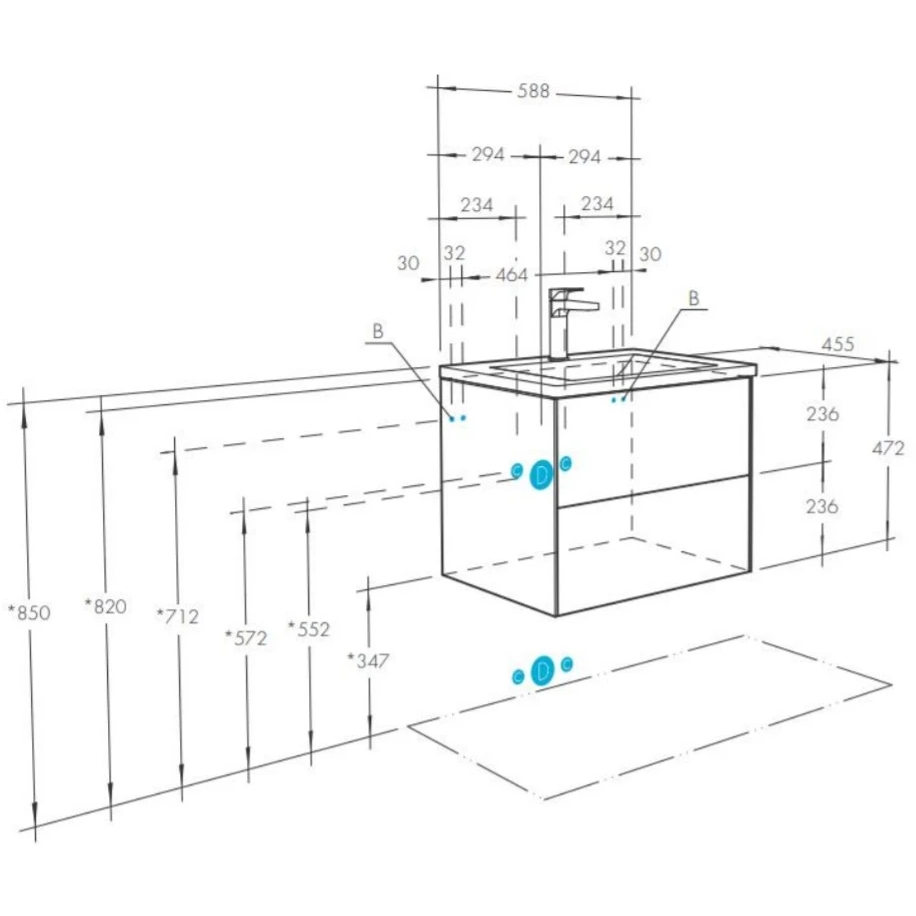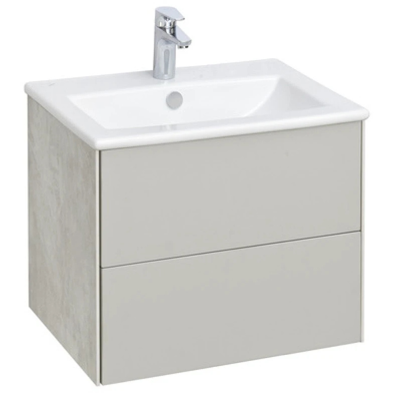 Тумба Сохо 60 функционально состоит из двух вместительных ящиков, оснащенных системой push to open, обеспечивающей надежное, комфортное и бесшумное закрывание. Фасады изделия выполнены из МДФ в пленке в цвете галька серая, корпус из ламинированной влагостойкой ДСП слэйт. Верхний и нижний ящики оснащены системой организации пространства, которая позволяет содержать косметические средства в идеальном порядке. Дополняет тумбу стильная раковина Элина от бренда Santek с удобной чашей. Все внутренние детали тумбы выполнены в цвете антрацит.