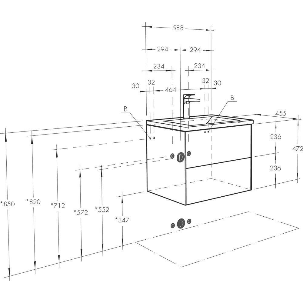 Габариты тумбы: 58,8x45,5x47,2 см. Подвесная установка позволяет экономить место и придает интерьеру современный вид. Оснащена механизмом доводчика для плавного закрывания. Тумба выполнена из ЛДСП с акриловым покрытием корпуса и фасадов из МДФ. Два вместительных ящика оснащены нажимным механизмом открывания. Гарантия на мебель — 3 года.
