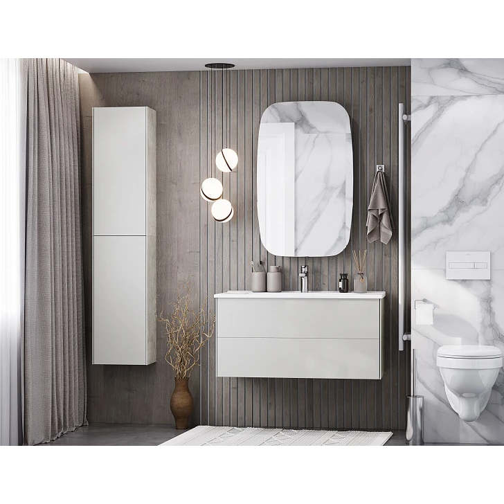 Тумба Сохо 75 функционально состоит из двух вместительных ящиков, оснащенных системой push to open, обеспечивающей надежное, комфортное и бесшумное закрывание. Фасады изделия выполнены из МДФ в пленке в цвете галька серая, корпус из ламинированной влагостойкой ДСП слэйт. Верхний и нижний ящики оснащены системой организации пространства, которая позволяет содержать косметические средства в идеальном порядке. Дополняет тумбу стильная раковина Элина от бренда Santek с удобной чашей. Все внутренние детали тумбы выполнены в цвете антрацит.