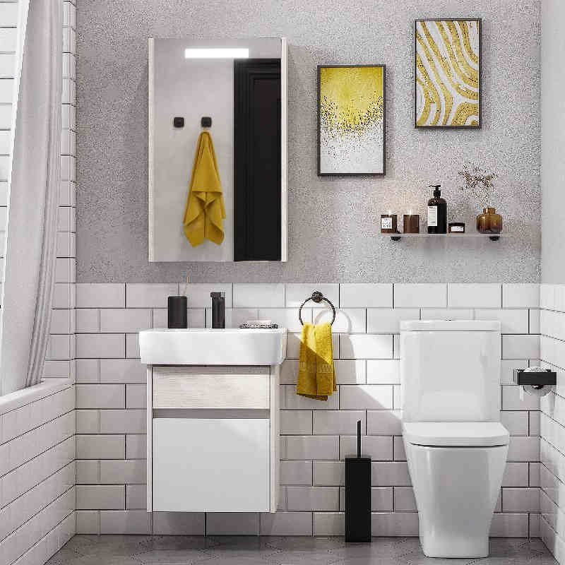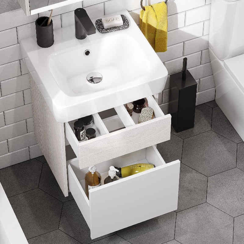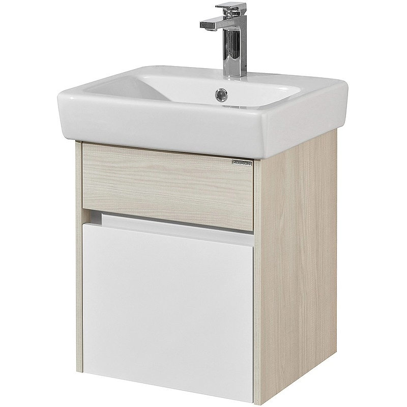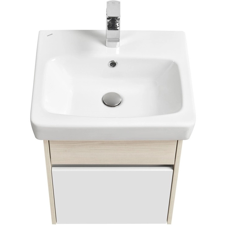 Подвесная тумба под раковину Верди 50 от AQUATON - функциональное и практичное решение для ванных комнат и санузлов со скромными габаритами. Компактная модель с комбинированной отделкой не занимает много места и позволяет разместить всё необходимое. Минималистичный дизайн подчеркивает отсутствие лицевой фурнитуры. Верхний фасад и корпус тумбы изготовлены из ламинированной, текстурированной влагостойкой ЛДСП в цвете ясень фабрик. Нижний фасад выполнен из МДФ и окрашен в белый цвет высокой степени глянца. Конструкция верхнего ящика подвесных тумб разделена на две секции, что очень удобно для хранения мелких предметов. Глубокий и вместительный нижний ящик предназначен для более габаритных предметов.