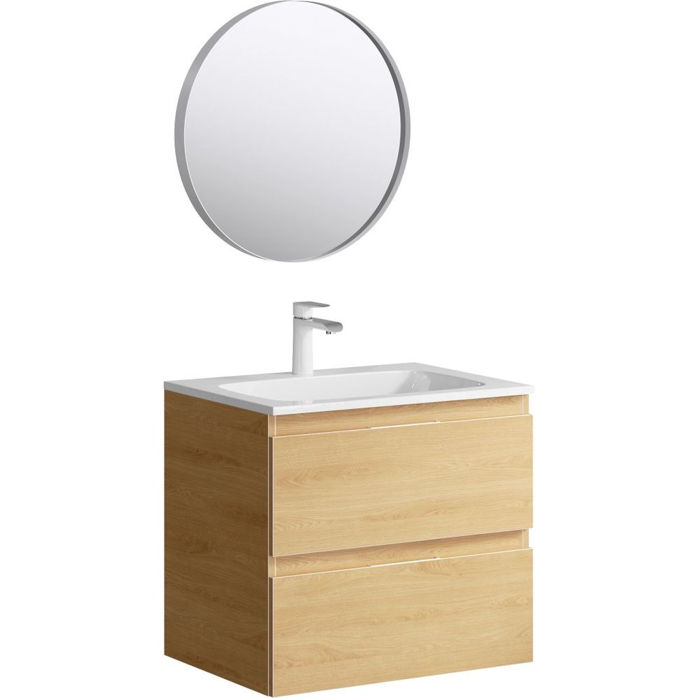 Комплект включает тумбу размером 60,5x44,5x54,3 см, выполненную из высококачественного ЛДСП с белой фурнитурой и механизмом доводчика, что обеспечивает плавное закрывание ящиков. Покрытие корпуса и фасада — износостойкий ламинат, гарантирующий защиту от влаги и повреждений.