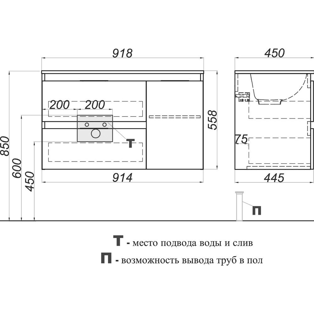 Тумба для комплекта Aqwella 5 stars Accent 90 L имеет размеры 91,4x44,5x54,3 см и выполнена из прочного ламинированного ДСП, что придаёт ей долговечность и защищённость от внешних воздействий. Подвесная конструкция обеспечивает эстетичный внешний вид и упрощает уборку. Тумба оснащена механизмом доводчика для плавного закрывания ящиков, предоставляя дополнительный комфорт и удобство.