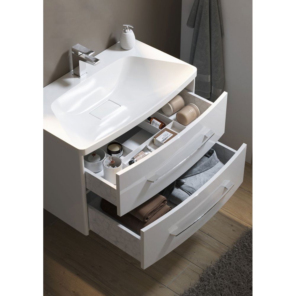 Тумба с раковиной Aqwella 5 stars Neringa 80 — это стильное решение для современной ванной комнаты. Подвесная конструкция не только экономит пространство, но и облегчает уборку. Глянец белоснежного фасада, дополненный хромированными элементами, визуально увеличивает небольшое помещение, наполняя его светом. Изделие изготовлено из влагостойкой МДФ с надежным защитным покрытием из пяти слоев эмали. Два вместительных выдвижных ящика обеспечивают удобное хранение, а внутреннее пластиковое лоток имеет отсеки для мелочей. Особые ручки с фирменной гравировкой не только красивы, но и функциональны. Ящики работают плавно благодаря скрытым направляющим. Тумба дополняется прочной раковиной из искусственного мрамора, что делает изделие долговечным и практичным.