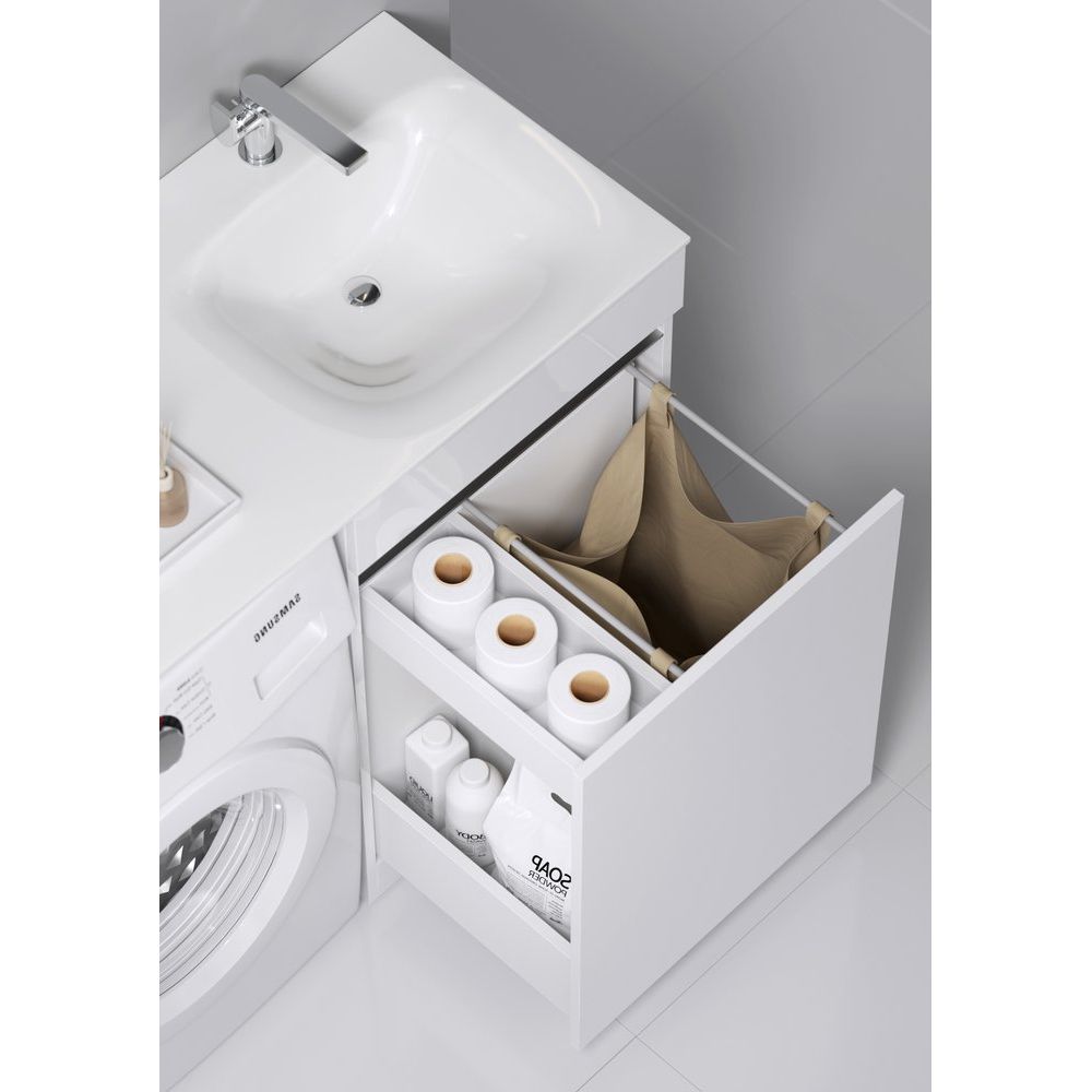 Тумба Aqwella Forma с бельевой корзиной расположена справа. Имеет габариты 53,5x49,2x87 см и предусмотрена для напольной установки. Она изготовлена из ДСП с покрытием из эмали и ламината, что обеспечивает стойкость к влажности. Оборудована встроенной корзиной и механизмом доводчика для плавного закрывания. Подходит для установки над стиральной машиной.