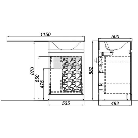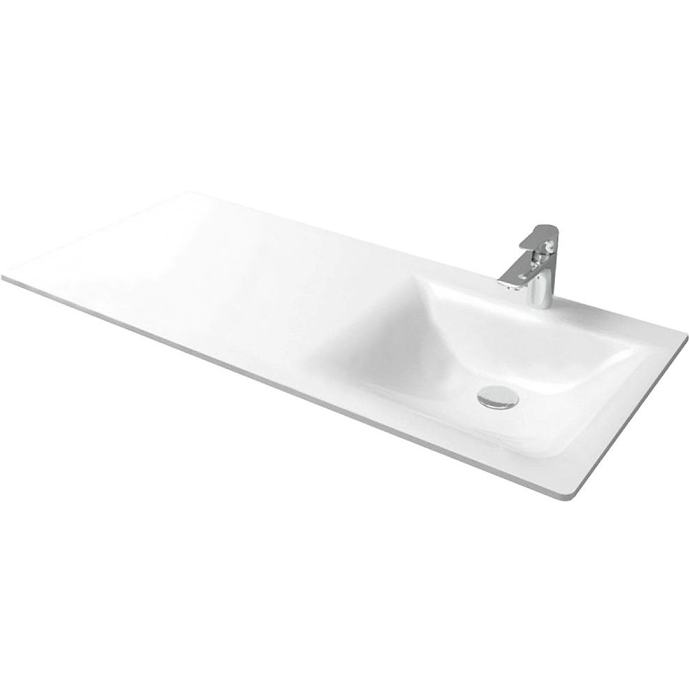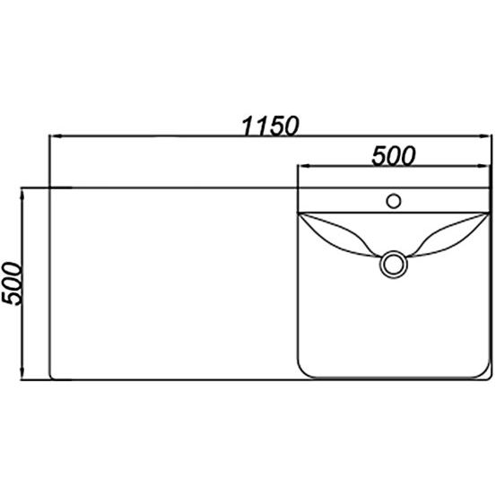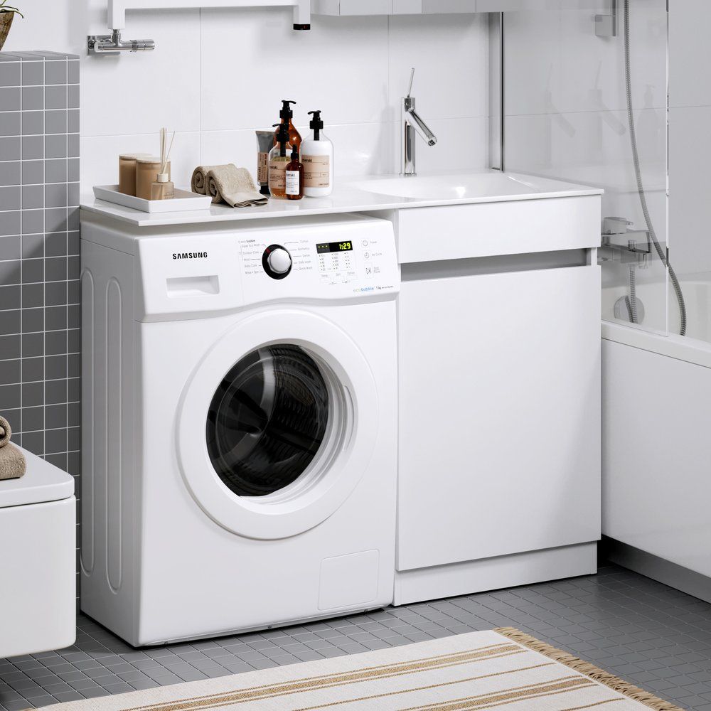 Мебельная раковина имеет размер 115x50 см, выполнена из искусственного мрамора и подвешивается над стиральной машиной. Имеет отверстие под смеситель и подходит для сифона диаметром 3.2 см. Донный клапан приобретается отдельно.
