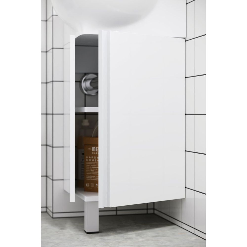 Тумба имеет компактные габариты (Ш Г В): 35,5x35,5x84 см, крепится к стене и дополнительно опирается на устойчивые ножки. Изготовлена из ламинированного ДСП (ЛДСП) с эмалированным покрытием и оснащена белой фурнитурой. Дверки открываются в нужную вам сторону, а внутри находятся несъемные полки, которые обеспечивают дополнительное место для хранения. Гарантия на тумбу составляет 2 года. Мебель производится в России.