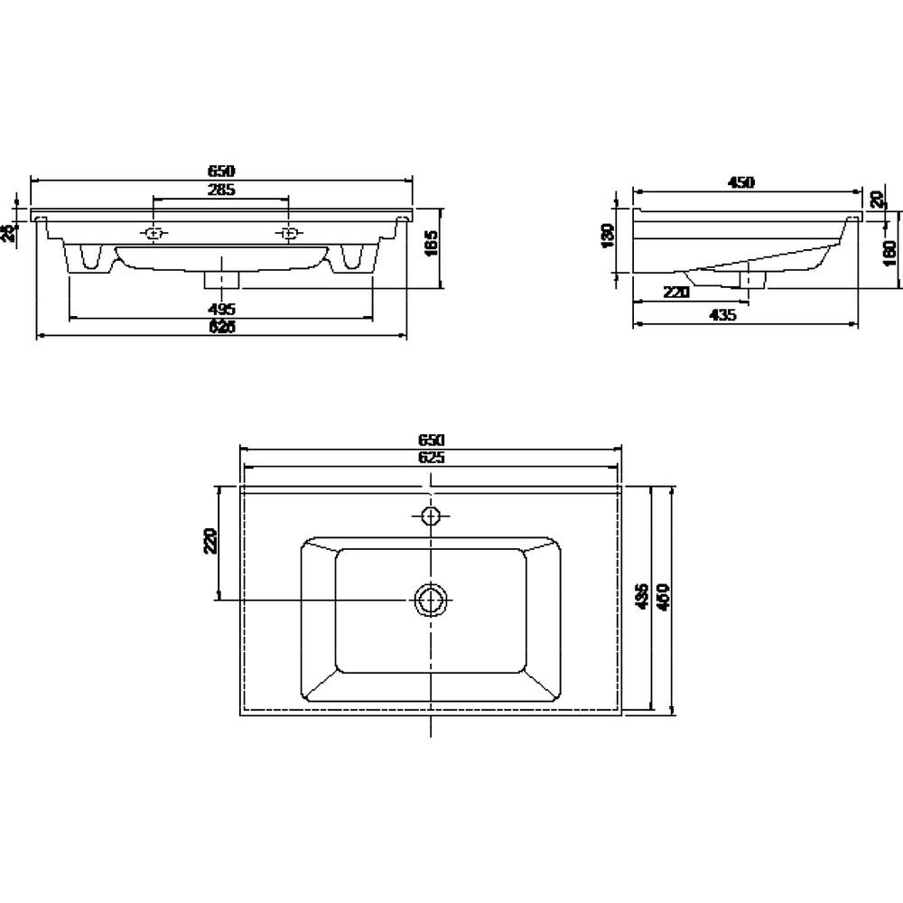 Мебельная раковина, выполненная из полимерной керамики, имеет габариты 65х46 см и оснащена встроенным сливом-переливом. В комплекте предусмотрено одно готовое отверстие под смеситель, а диаметр сифона должен составлять 3.2 см. Для установки потребуется докупить донный клапан.
