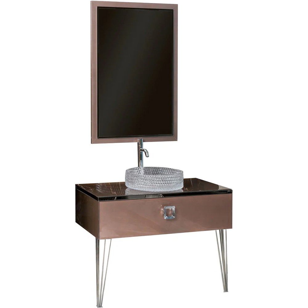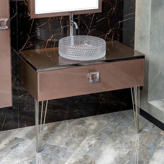 - Столешница в розовом стекле размером 101x52x0.8 см оснащена отверстием под смеситель.
