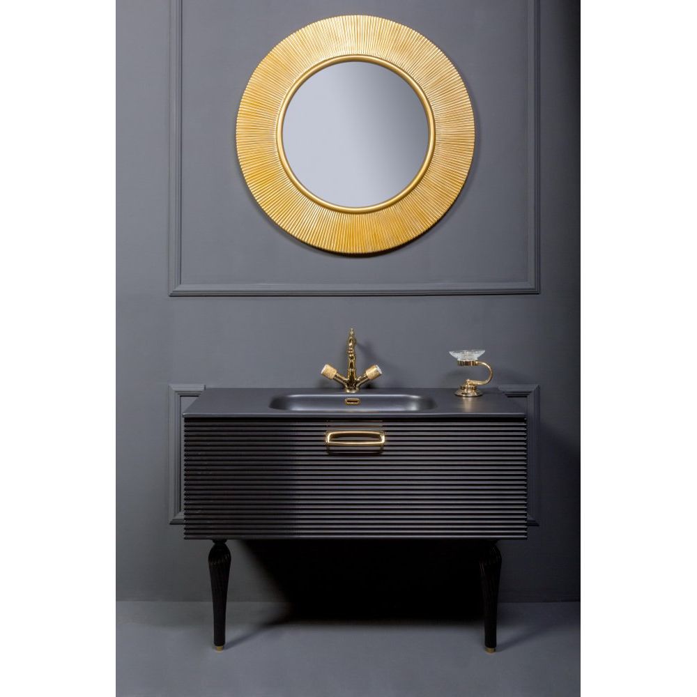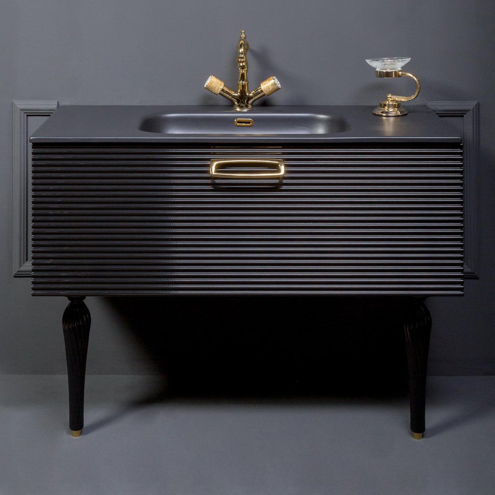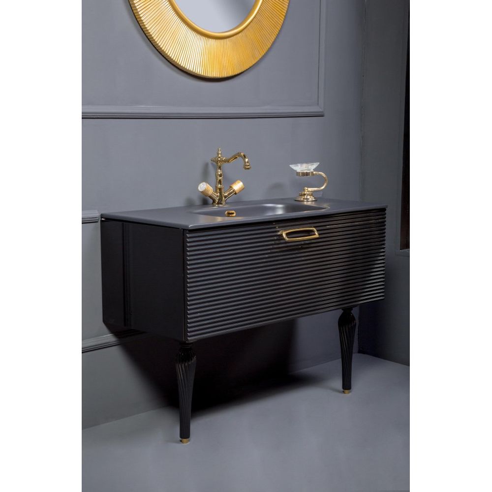 Тумба Armadi Art Vallessi Avangarde Linea 100 выполнена в черном цвете и изготовлена из МДФ с акриловым покрытием, что обеспечивает ей долговечность и устойчивость к влаге. Габариты тумбы составляют 100x45x38 см, она подвесная, оснащена доводчиком для плавного закрывания. Фурнитура золотого цвета добавляет ей особый шарм.
