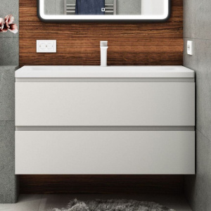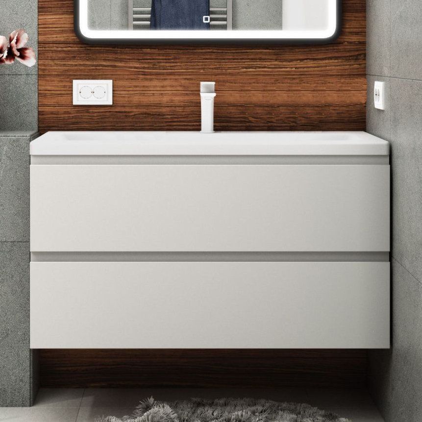 Мебельная раковина имеет размеры 100x44,7 см и изготовлена из искусственного мрамора — материала, который обеспечивает легкость в уходе и долговечность. Она оснащена встроенным сливом-переливом, а также декоративной накладкой на слив, что добавляет изысканности.