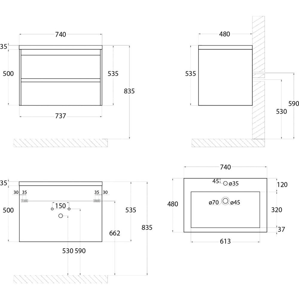 Тумба Art&Max Family 75 имеет габариты 73,7x48x50 см и предназначена для подвесной установки, что помогает сэкономить полезное пространство на полу. Корпус и фасад тумбы выполнены из ЛДСП и покрыты акрилом, обеспечивающим устойчивость к влаге и простоту обслуживания. Мебельная раковина изготовлена из искусственного мрамора, имея размеры 74,6x47,8 см, и оснащена слив-переливом, а также одним готовым отверстием под смеситель. Предусмотрена установка сифона диаметром 3.2 см, который приобретается отдельно.