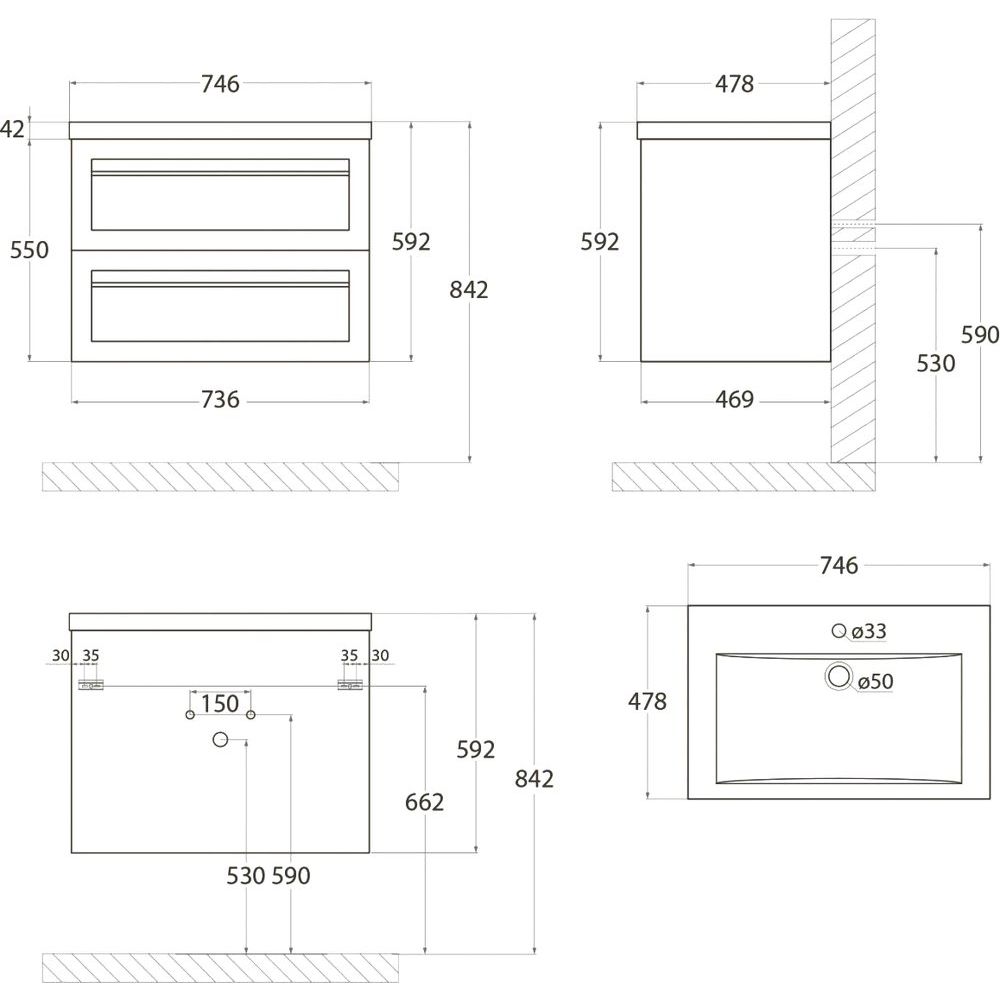 Тумба с габаритами 73,6x46,9x55 см выполнена из МДФ с эмалевым покрытием, что обеспечивает надежную защиту и долговечность. Ящики оснащены механизмом доводчика, который обеспечивает комфортное закрывание. Раковина из искусственного мрамора размером 74,6x47,8 см располагает готовым отверстием под смеситель и комплектуется арматурой для слива-перелива. Комплект не включает донный клапан, и его необходимо приобретать отдельно. Гарантия на изделие составляет 2 года.