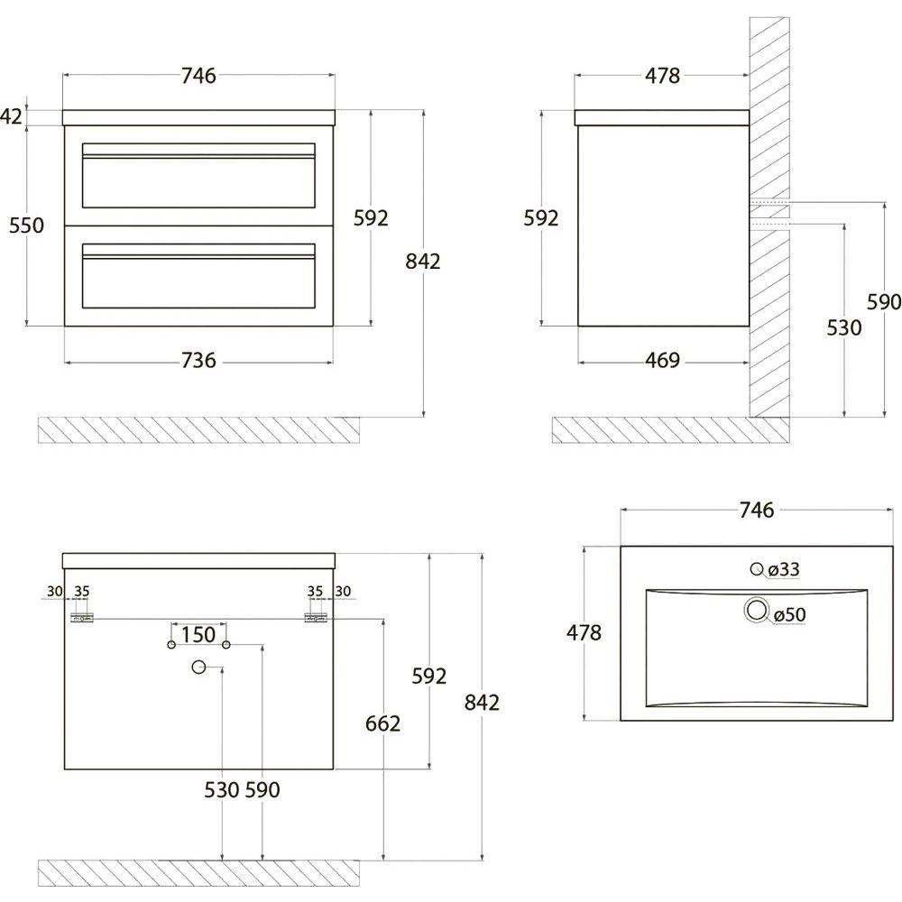 Тумба для комплекта Art&Max Platino — это подвесная конструкция с габаритами 73,6x46,9x55 см. Изготовлена из МДФ с эмалевым покрытием, что обеспечивает длительный срок службы и устойчивость к влажной среде. Модель включает ящики с механизмом доводчика для плавного и бесшумного закрывания. В комплект входит мебельная раковина Art&Max AM-LAV 75, выполненная из искусственного мрамора и оснащенная сливом-переливом. Раковина имеет размеры 74,6x47,8 см, приготовленное отверстие под смеситель и требует приобретения донного клапана отдельно. Сифон диаметром 3.2 см придется подобрать индивидуально в зависимости от конструкции тумбы.