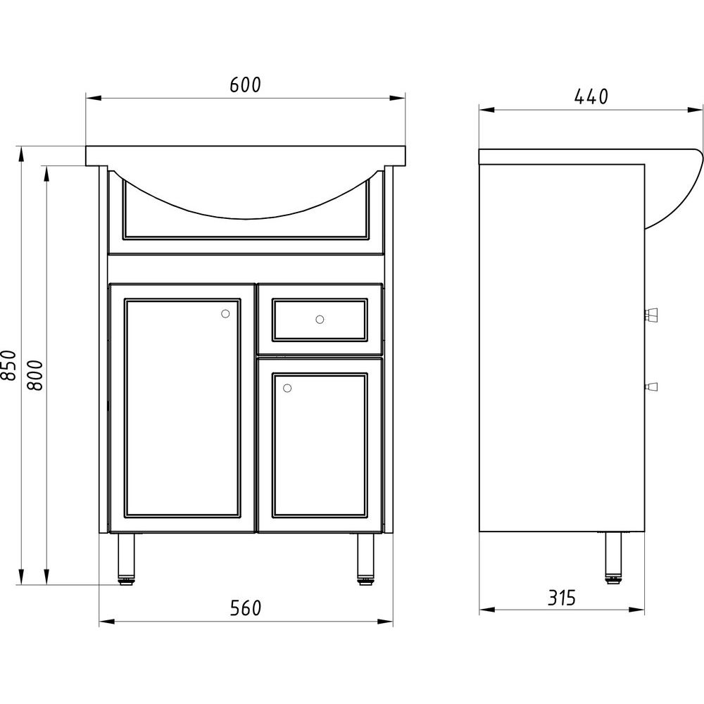 Комплект мебели включает в себя тумбу и раковину. Габариты тумбы составляют 56x31,5x80 см, она имеет подвесную конструкцию и укомплектована декоративными ножками. Использованные материалы — ДСП с пленочным покрытием, с фурнитурой в цвете хром. Раковина Santek Балтика 60 размера 61x44,5 см, выполненная из фарфора, включает слив-перелив и готовое отверстие под смеситель. Донный клапан приобретается отдельно, а установка сифона требует тщательного подбора по параметрам тумбы. Общая гарантия на тумбу составляет 1 год, на раковину — 10 лет, страна производитель — Россия.