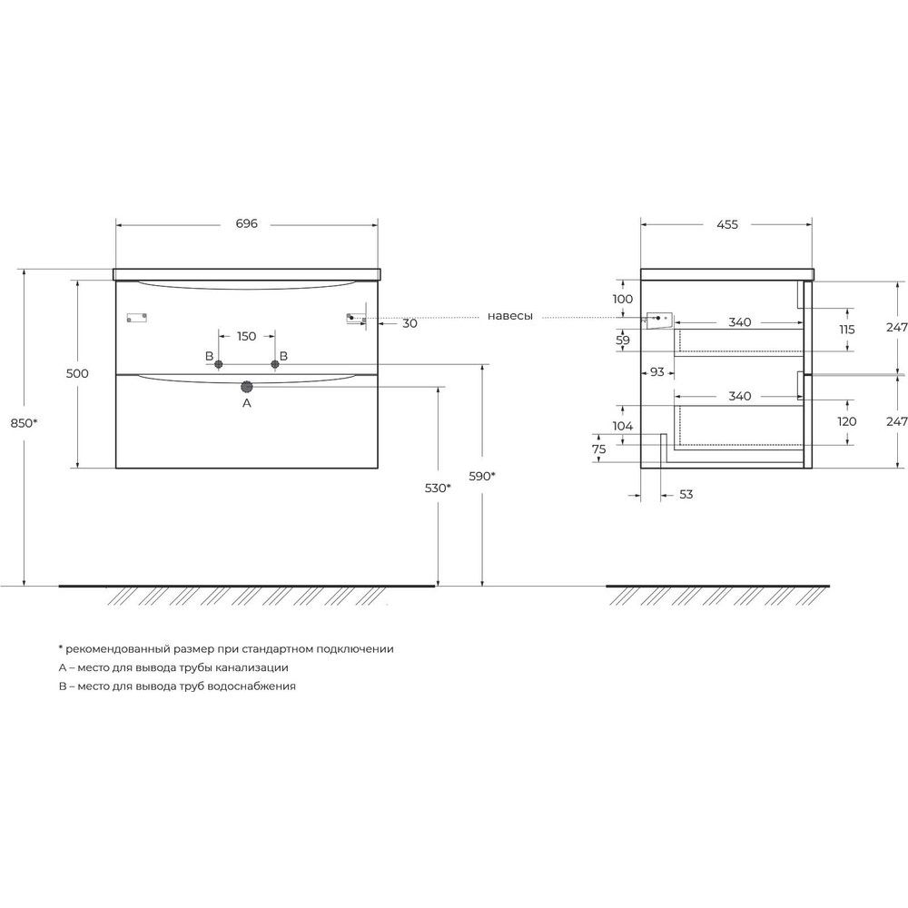 При выборе сифона необходимо внимательно учитывать конструкцию тумбы с раковиной и подбирать его индивидуально по параметрам изделия. Донный клапан не входит в комплект и при необходимости приобретается отдельно. Обратите внимание на подготовленное в раковине отверстие под смеситель для более простой установки. Убедитесь, что место установки позволяет надежно закрепить подвесную конструкцию.