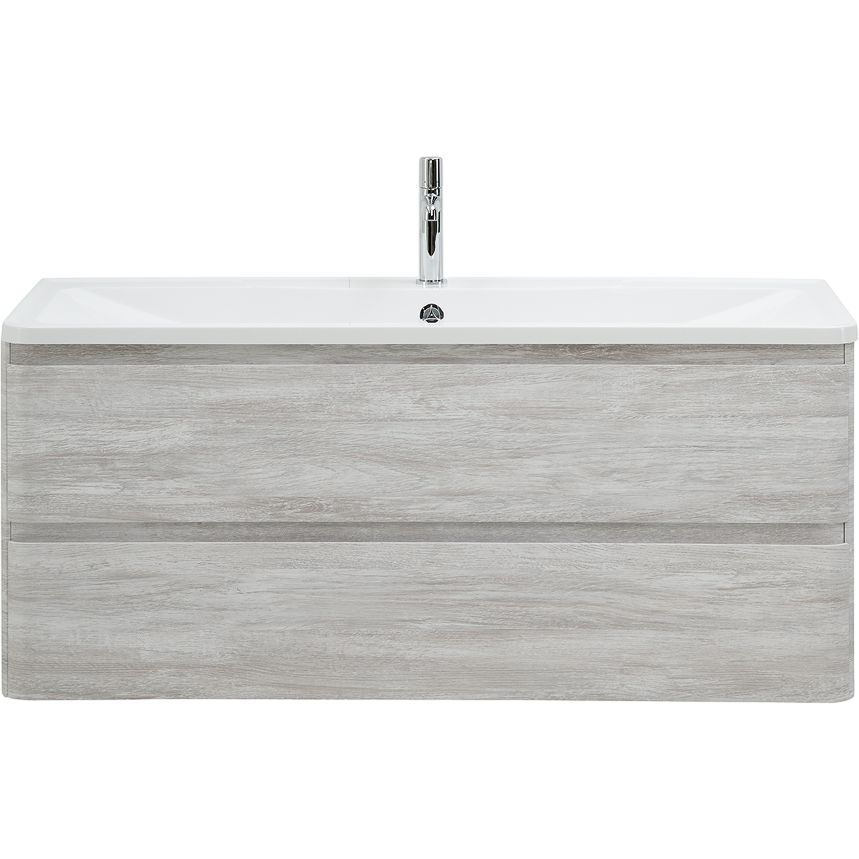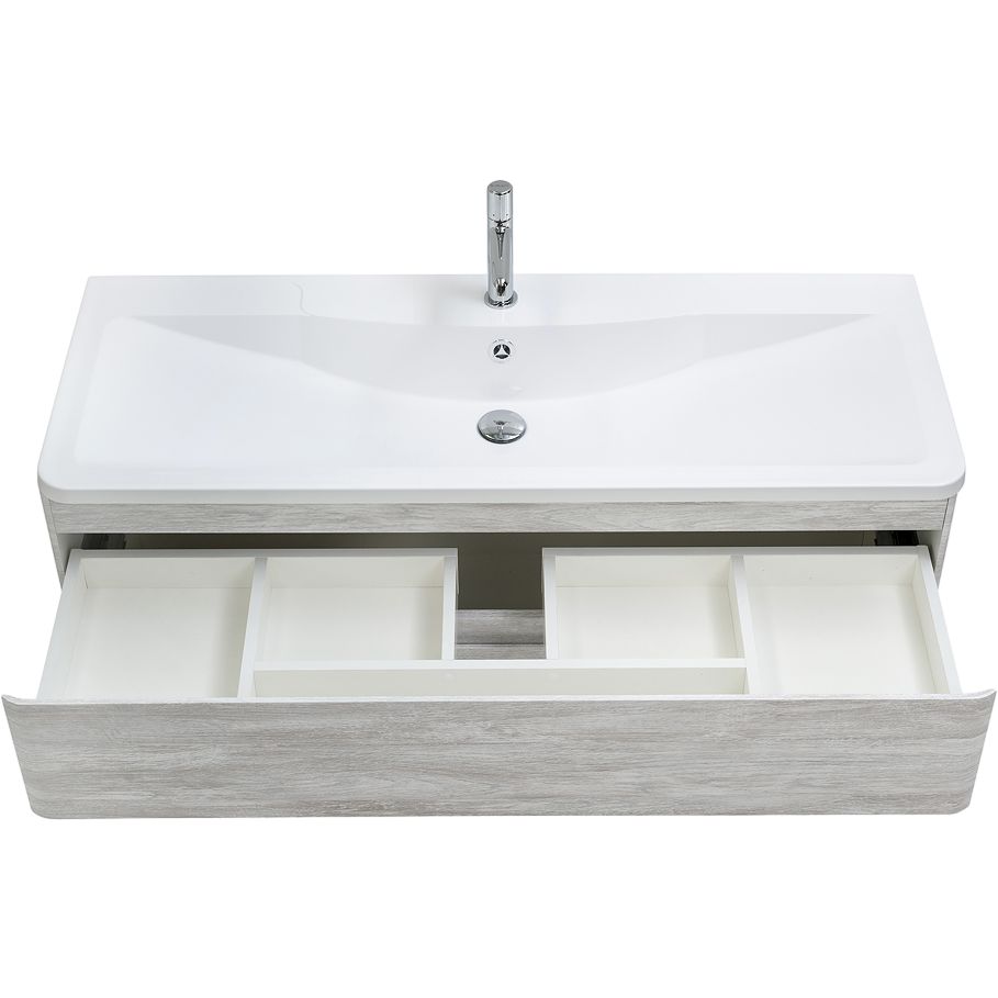 Тумба BelBagno Albano 120 имеет размеры 119,2x45,5x50 см, выполнена из качественного МДФ и покрыта пленкой для дополнительной защиты. Подвесная конструкция и наличие мягкого доводчика обеспечивают комфорт в использовании. Раковина из литьевого мрамора размером 120x45,5 см имеет отверстие под смеситель. В комплекте предустановлен слив-перелив, однако донный клапан необходимо приобрести отдельно.