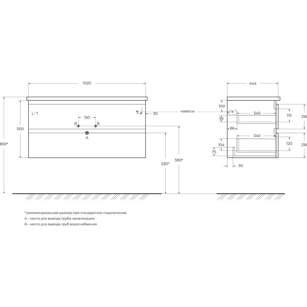 - Тумба подвесная габаритами 102x44,4x50 см, материал: МДФ с пленочным покрытием.