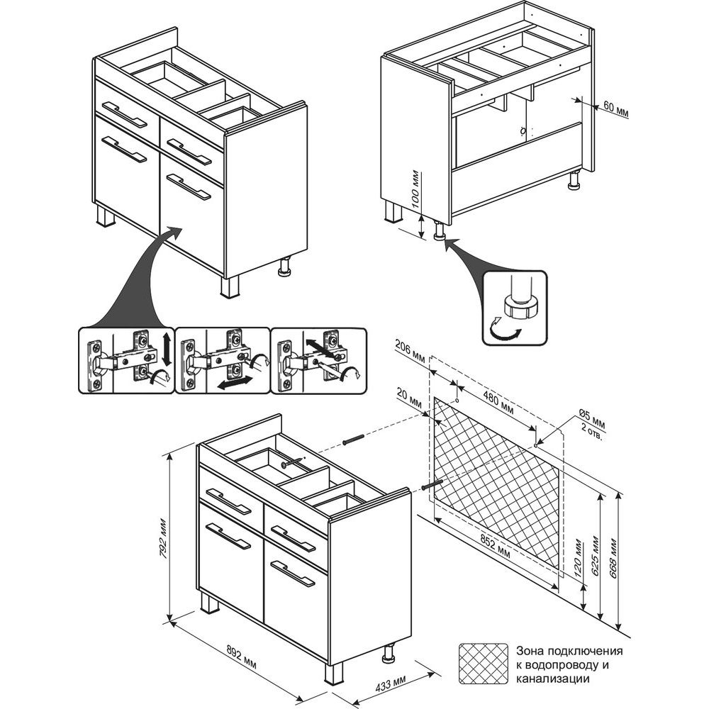 Перед установкой тумбы с раковиной необходимо закрепить тумбу к стене, что обеспечивает дополнительную безопасность и стабильность конструкции. Пожалуйста, учитывайте, что мебель поставляется в собранном виде, а подходящий сифон необходимо подбирать индивидуально, учитывая особенности конструкции. Использование ножек в комплекте обеспечивает обязательную дополнительную опору, что важно для правильного функционирования ванного комплекта.
