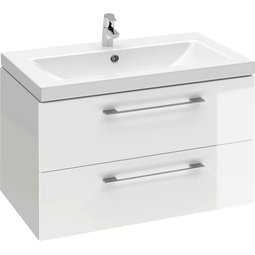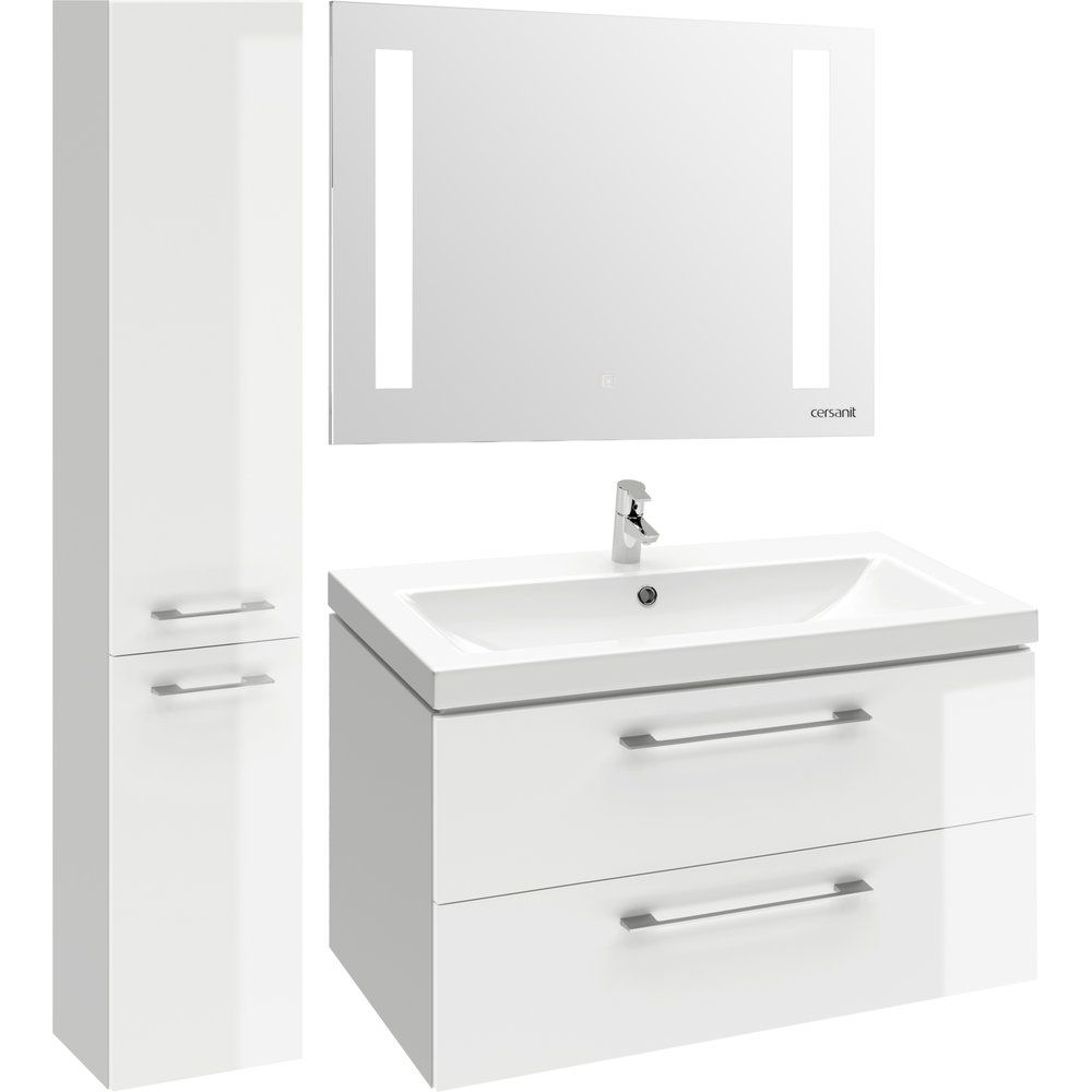 Подвесная тумба Cersanit Lara 80 имеет габариты 77,6x47x46 см и выполнена в белом цвете. Корпус из ДСП покрыт эмалью и ламинатом, а фасад — из эмалированного МДФ. Два ящика открываются на 80% и обладают качественными доводчиками. Раковина Cersanit Como размерами 80x45 см выполнена из фарфора, имеет встроенные слив-перелив и готовое отверстие под смеситель. Для установки потребуется донный клапан (приобретается отдельно). Раковина подвесная и предназначена для сифона диаметром 3.2 см. Вся фурнитура — хромированная.