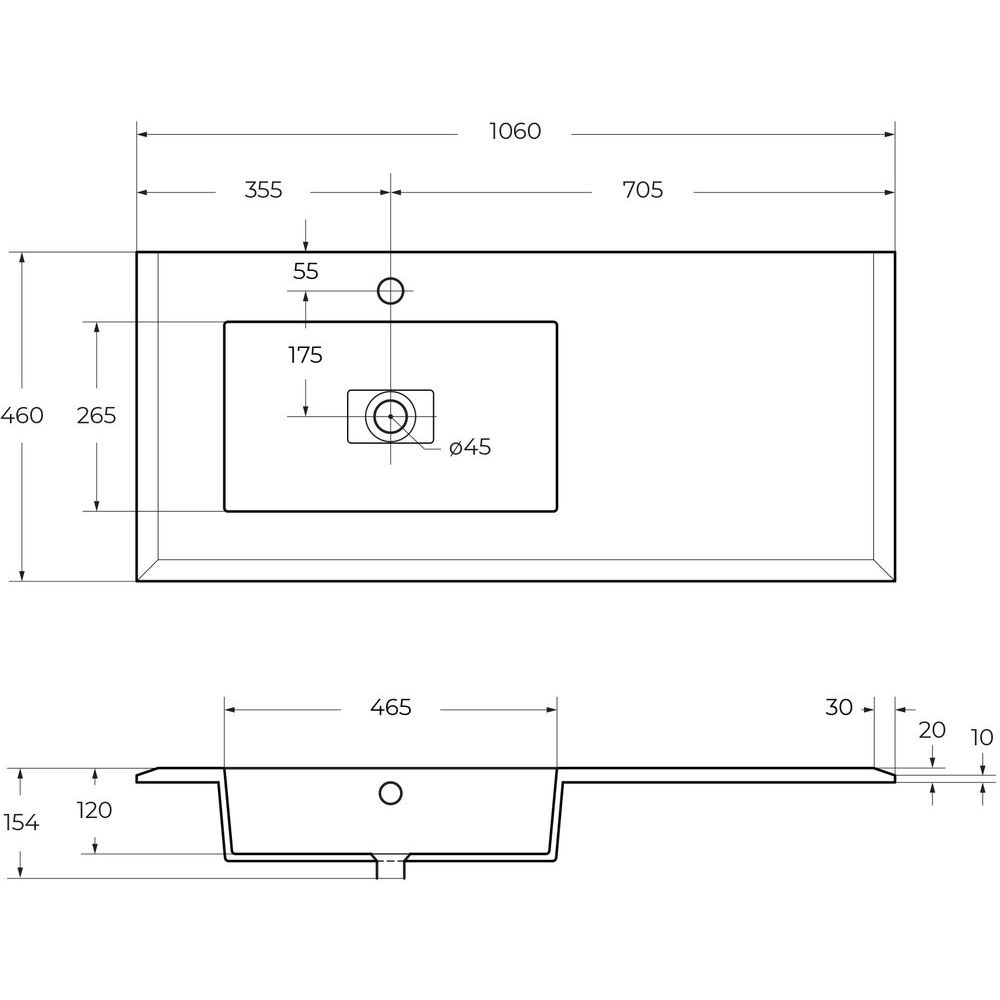 Раковина из искусственного камня имеет размеры 106x46 см и оснащена декоративной накладкой на слив, с одним отверстием под смеситель. Обратите внимание, что установка донного клапана не предусмотрена, а слив-перелив нужно приобретать отдельно.