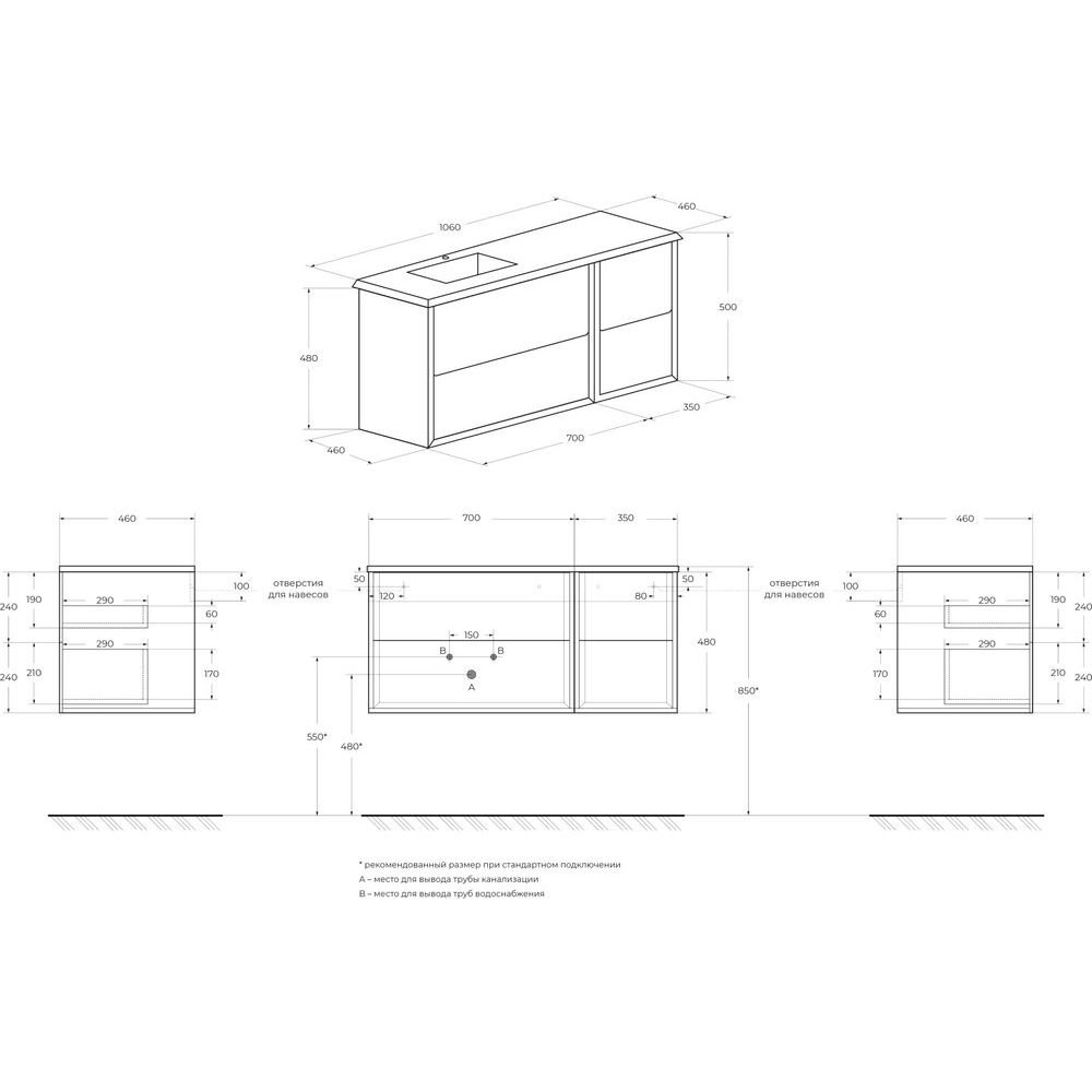 Дополнительный ящик размером 35x46x48 см предоставляет дополнительное пространство для хранения и подвесного монтажа, гармонично дополняя основной комплект.