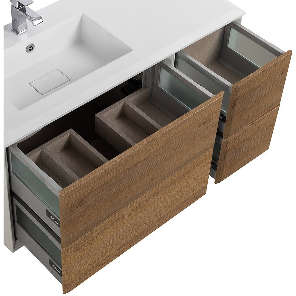 Основная тумба из коллекции Cezares Bellagio обладает размерами 70x46x48 см и идеально подходит для подвесной установки. Корпус и фасад изготовлены из МДФ и покрыты пленкой, что обеспечивает долговечность и простой уход. Два ящика оснащены нажимным механизмом открывания и доводчиками для комфортного использования.