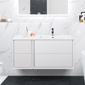 Перед приобретением уточните параметры и особенности конструкции тумбы для правильного подбора сифона. Обратите внимание, что раковина не предусматривает установку донного клапана, а слив-перелив нужно приобретать отдельно. Мебель поставляется в собранном виде, что экономит время при установке.
