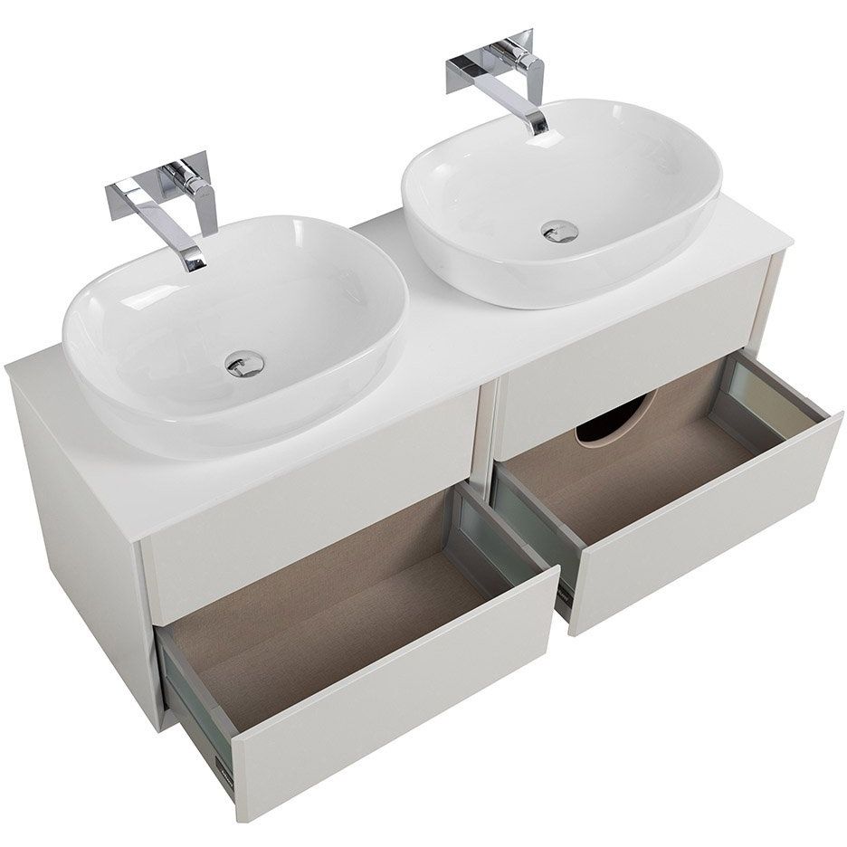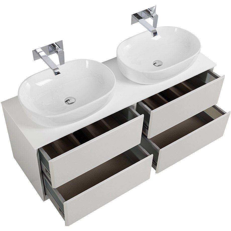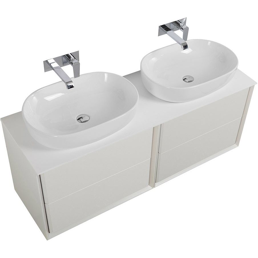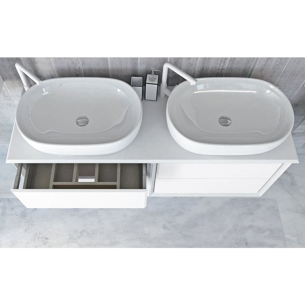 Тумба Cezares Bellagio 70 имеет размеры 70x46x48 см и выполнена в цвете bianco opaco. Подвесная конструкция экономит пространство, механизмы доводчиков мягко закрывают ящики, а нажимной механизм добавляет удобства. Корпус и фасад произведены из МДФ, отделанных пленкой, что обеспечивает устойчивость к воздействию влаги. Мебельная раковина Cezares Bellagio размером 60x42 см сделана из высококачественного фарфора и имеет отверстие для сифона диаметром 3.2 см, хотя донный клапан приобретается отдельно. Столешница из искусственного камня размером 141x46x1.2 см идет без отверстий для смесителя, позволяя самостоятельно выбрать место установки.