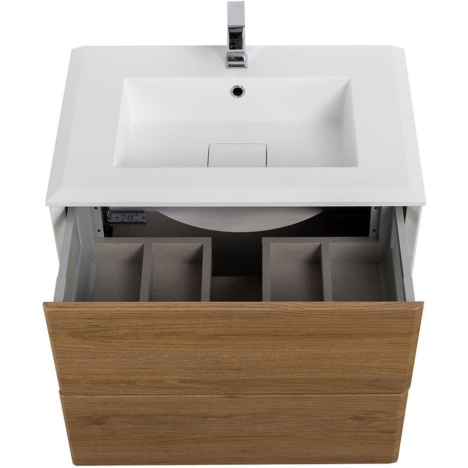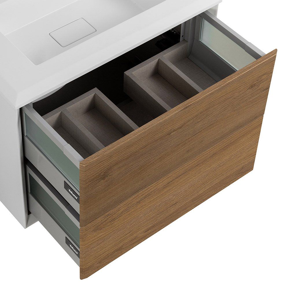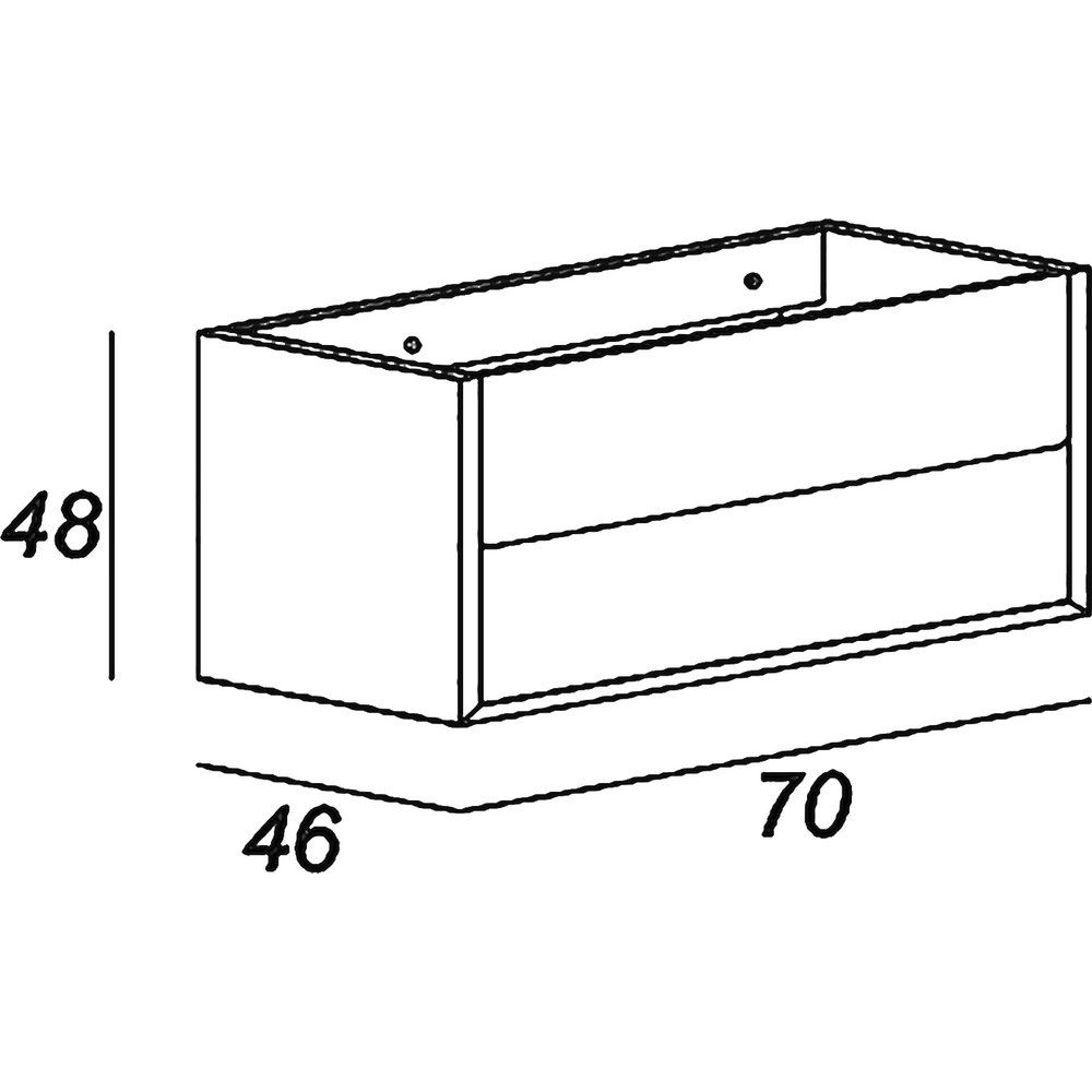 Тумба для комплекта Cezares Bellagio 70 отличается подвесной конструкцией и размерами 70x46x48 см, что позволяет экономить место и создаёт ощущение лёгкости в интерьере. Изготовлена из влагостойкого МДФ с пленочным покрытием. Два ящика с механизмами push-to-open и доводчиками позволяют удобно хранить аксессуары. Мебельная раковина Bellagio 50212 размером 71x46 см выполнена из искусственного камня. Она имеет одно готовое отверстие для смесителя и декоративную накладку на слив. Для подключения потребуется приобести отдельно подходящий сифон и слив-перелив.