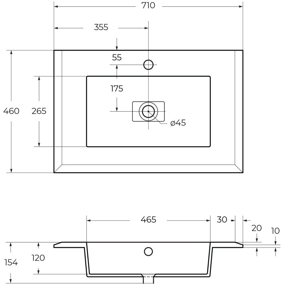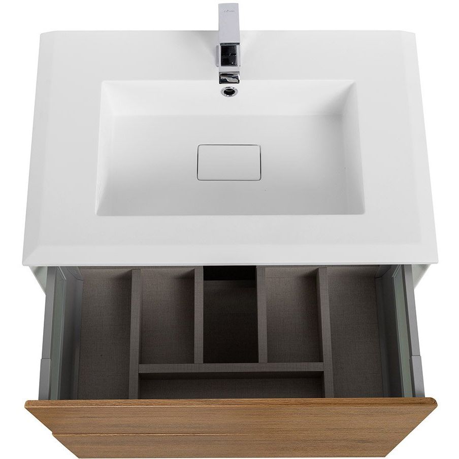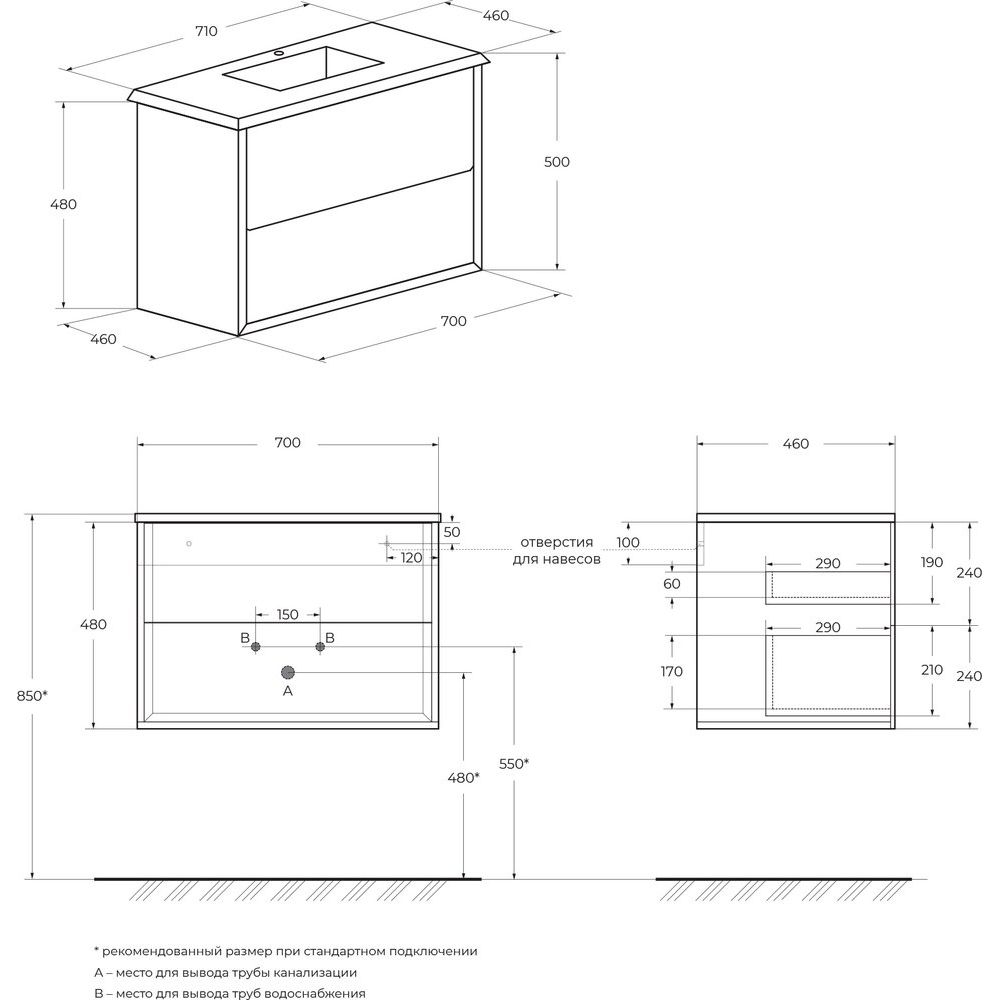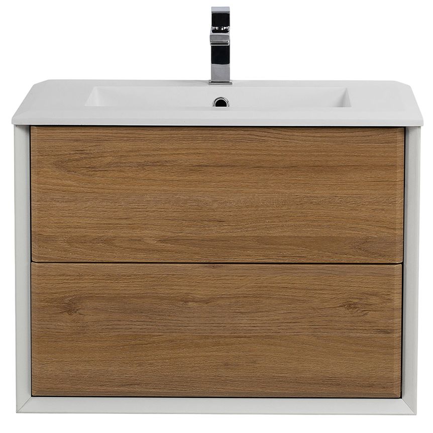 Тумба для комплекта Cezares Bellagio 70 отличается подвесной конструкцией и размерами 70x46x48 см, что позволяет экономить место и создаёт ощущение лёгкости в интерьере. Изготовлена из влагостойкого МДФ с пленочным покрытием. Два ящика с механизмами push-to-open и доводчиками позволяют удобно хранить аксессуары. Мебельная раковина Bellagio 50212 размером 71x46 см выполнена из искусственного камня. Она имеет одно готовое отверстие для смесителя и декоративную накладку на слив. Для подключения потребуется приобести отдельно подходящий сифон и слив-перелив.