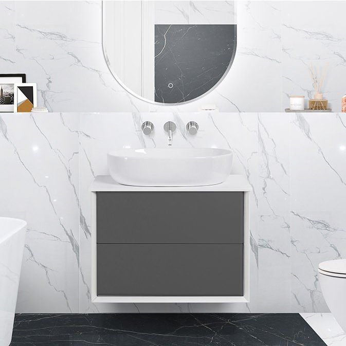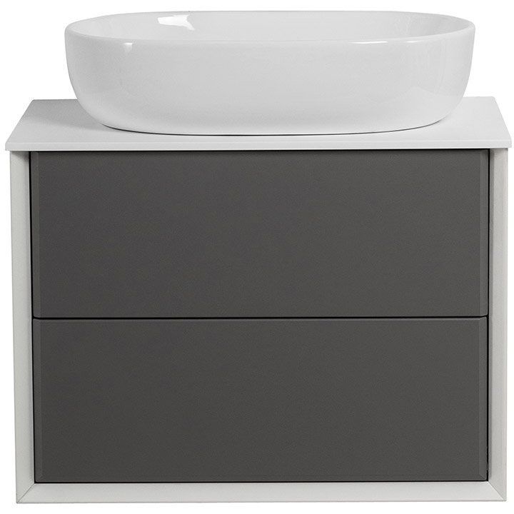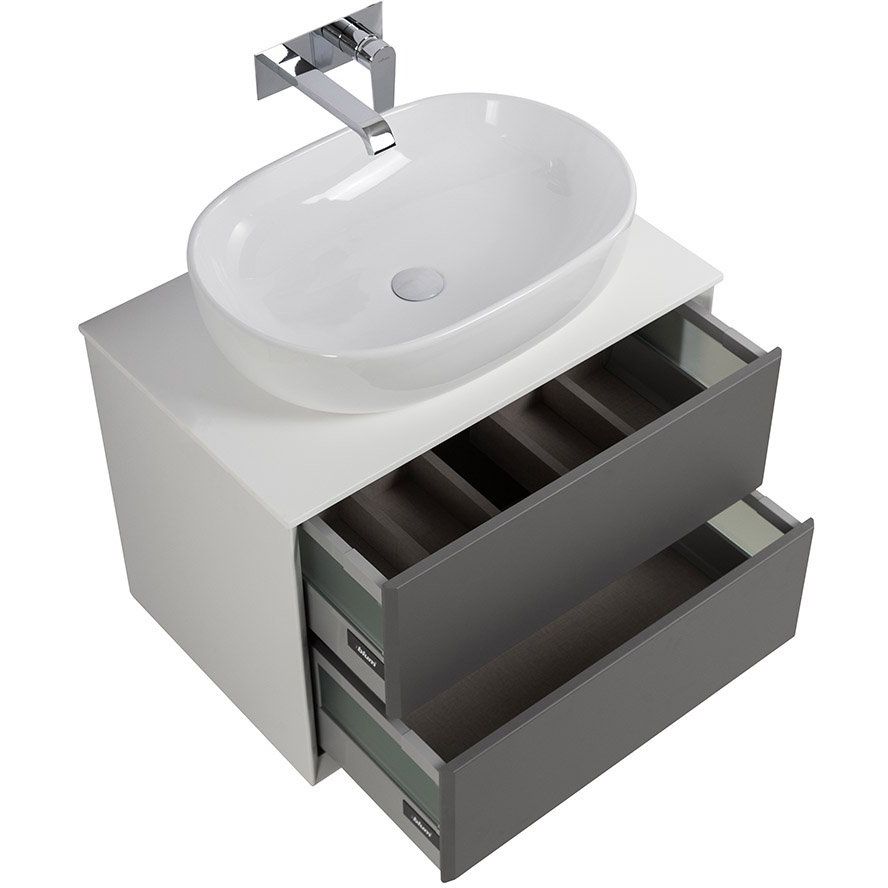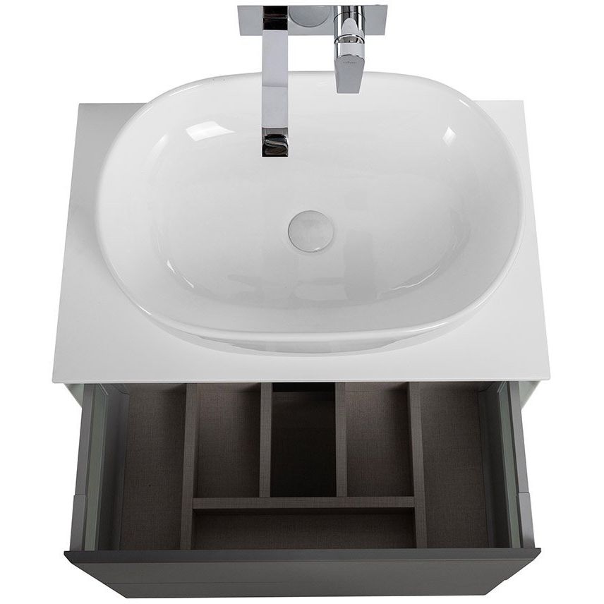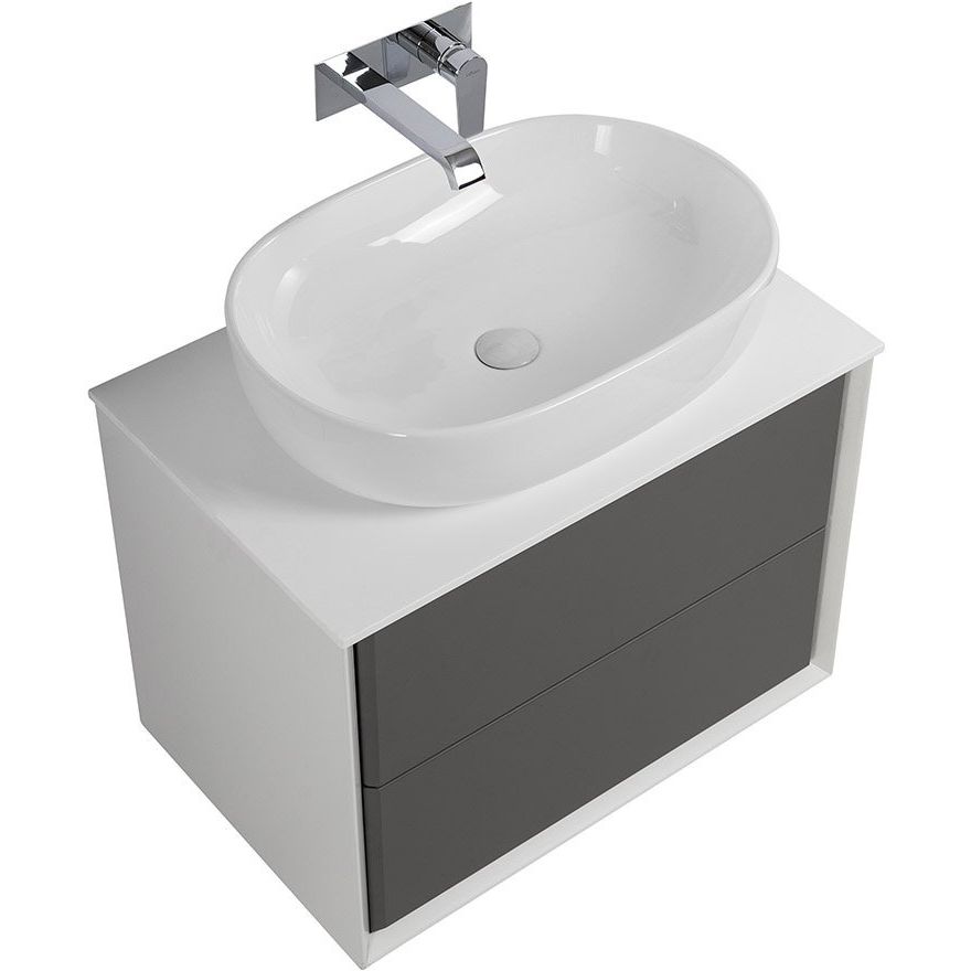 Комплект оснащен мебельной раковиной Cezares Bellagio 50179 из фарфора, шириной 60 см и глубиной 42 см. Она требует сифона диаметром 3.2 см, который приобретается отдельно. Также включает столешницу из искусственного мрамора без отверстий под смеситель, габариты столешницы 71x46x1.6 см.