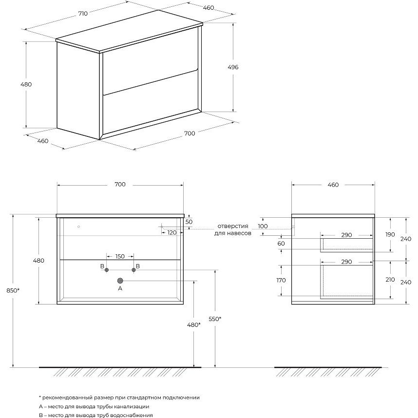 Мебель поставляется в собранном виде, что значительно упрощает процесс установки. Обратите внимание, что при покупке сифона необходимо учитывать конструктивные особенности тумбы и подбирать устройство индивидуально. Столешница поставляется без отверстий под смеситель, что позволяет выбрать их расположение по своему усмотрению.
