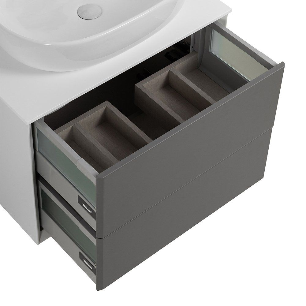 Тумба для комплекта Cezares Bellagio 70 выполнена из МДФ с пленочным покрытием, её габариты составляют 70x46x48 см. Тумба оснащена ящиками с нажимным механизмом открывания, что обеспечивает лёгкий доступ к содержимому. Подвесная конструкция облегчает монтаж и минимизирует занимаемое пространство.