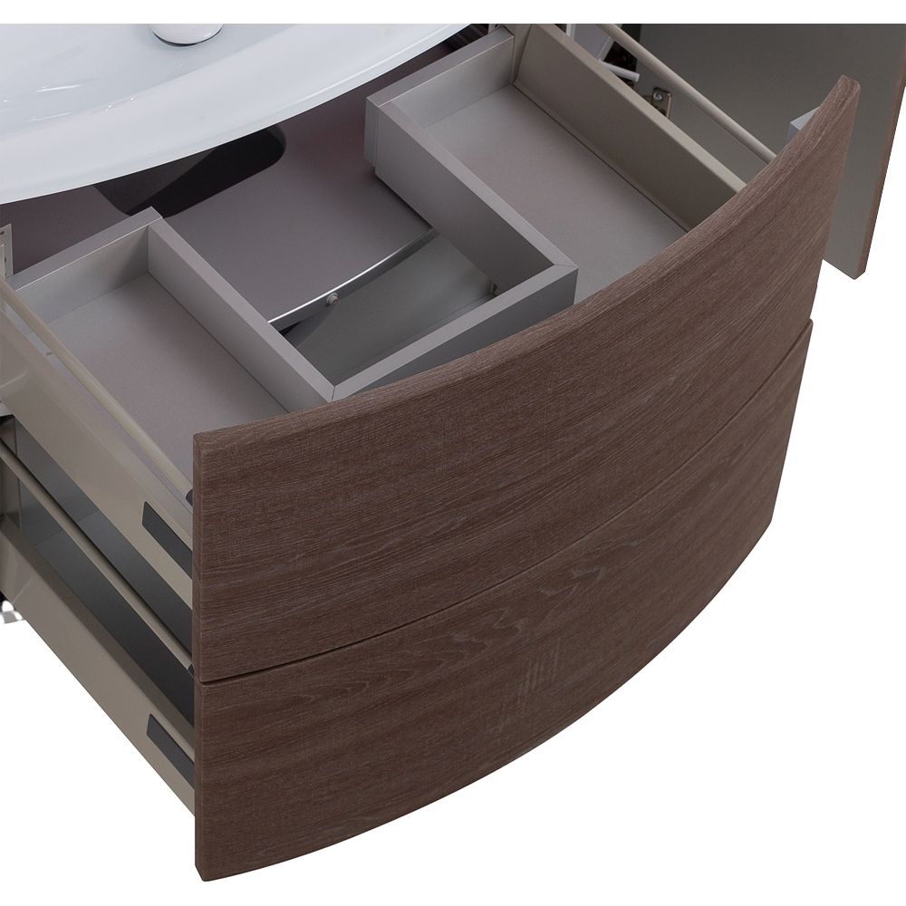 Тумба Cezares Eden 120 rovere scuro soft имеет размеры 121x51x55 см, что позволяет полностью использовать пространство под раковиной. Подвесная конструкция облегчает уборку. Изготовлена из МДФ, покрытого прочной пленкой для долгого срока службы. Фасады оснащены нажимным механизмом открывания, а наличие доводчика обеспечивает плавное закрывание ящиков.