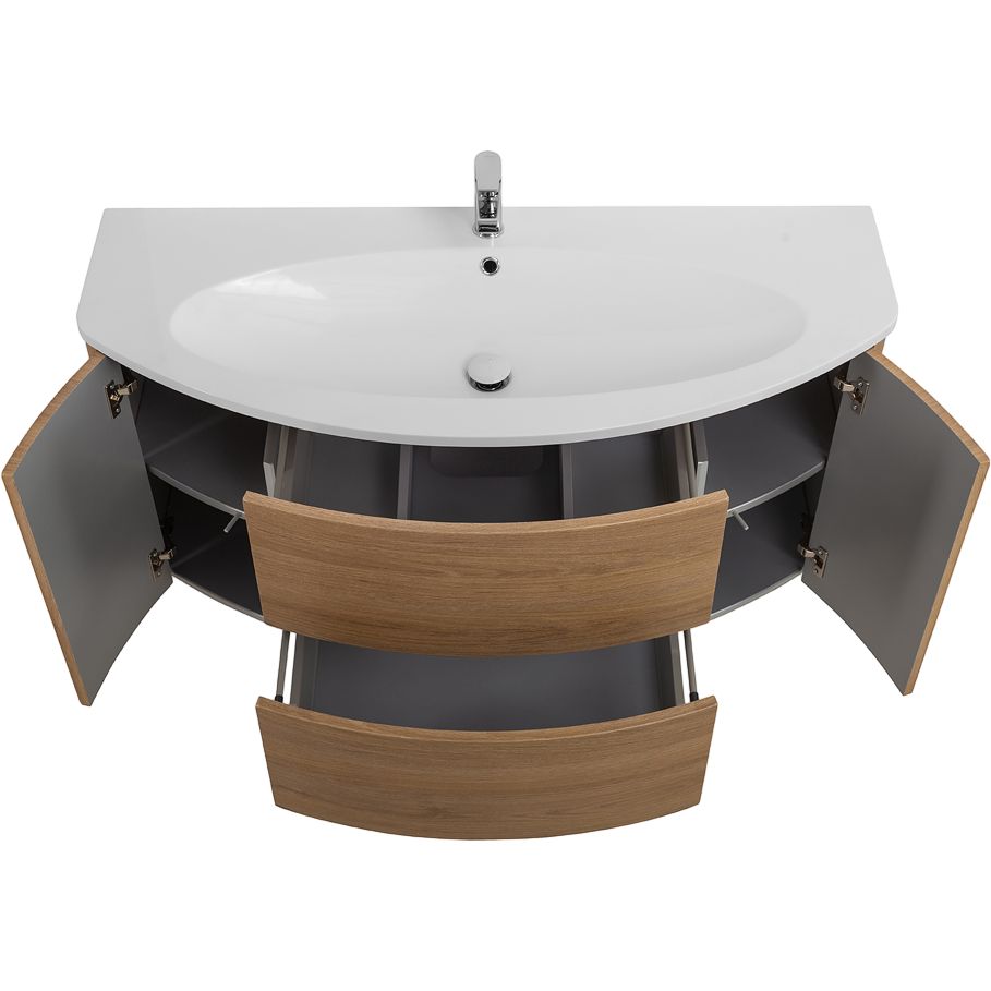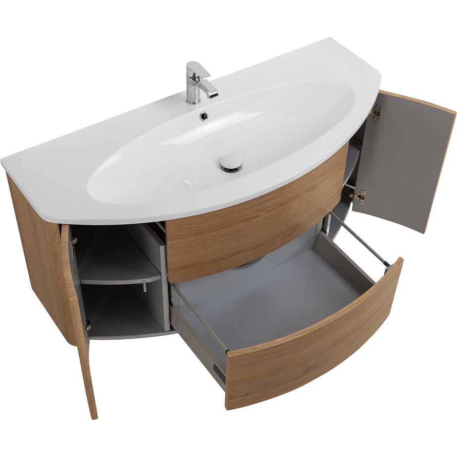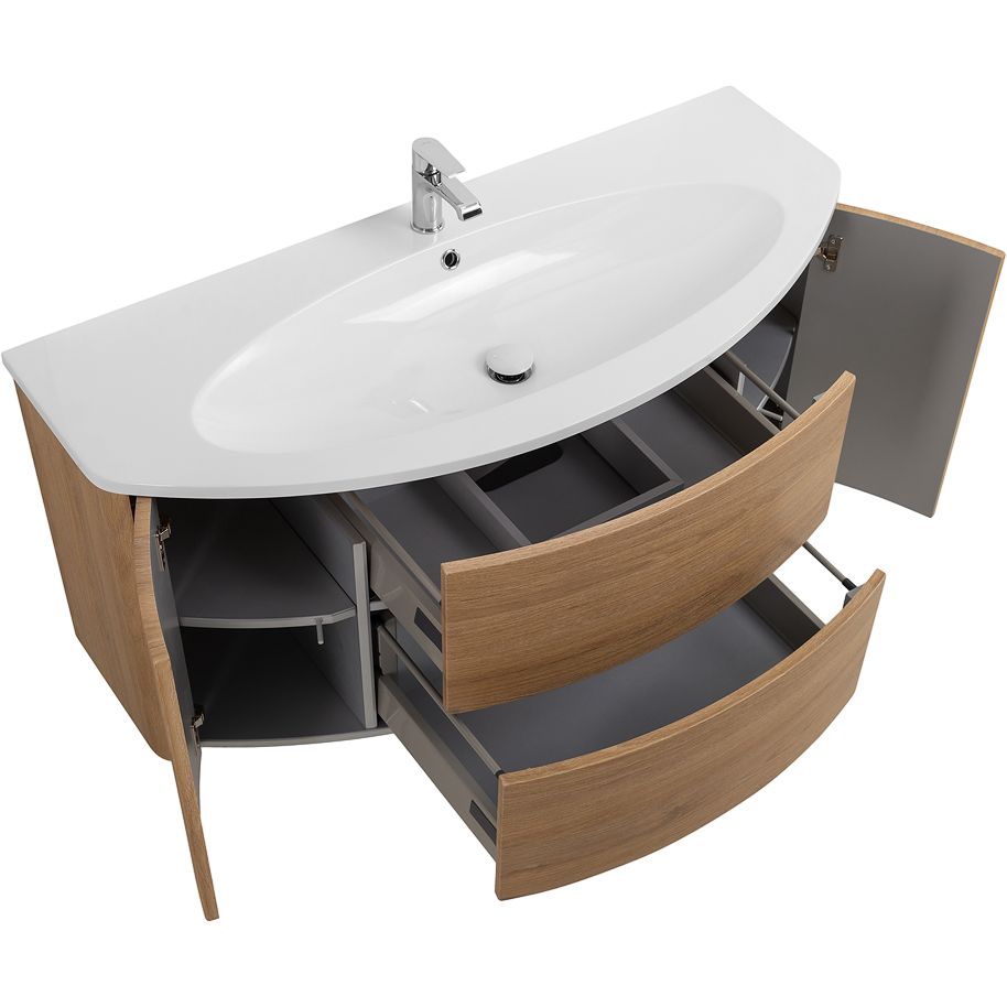 Тумба Cezares Eden 120 rovere tabacco имеет габариты 121x51x55 см и подвесную конструкцию, что упрощает уборку под ней. Оснащена доводчиком для плавного закрывания и нажимным механизмом открывания дверок. Корпус и фасад выполнены из МДФ, покрытого пленкой. Комплект дополняет мебельная раковина Cezares Eden 50178 Bianco с размерами 122,5x51,5 см из искусственного камня. Раковина рассчитана на сифон диаметром 3.2 см и имеет одно отверстие под смеситель. Для установки потребуется дополнительно приобрести донный клапан и слив-перелив.